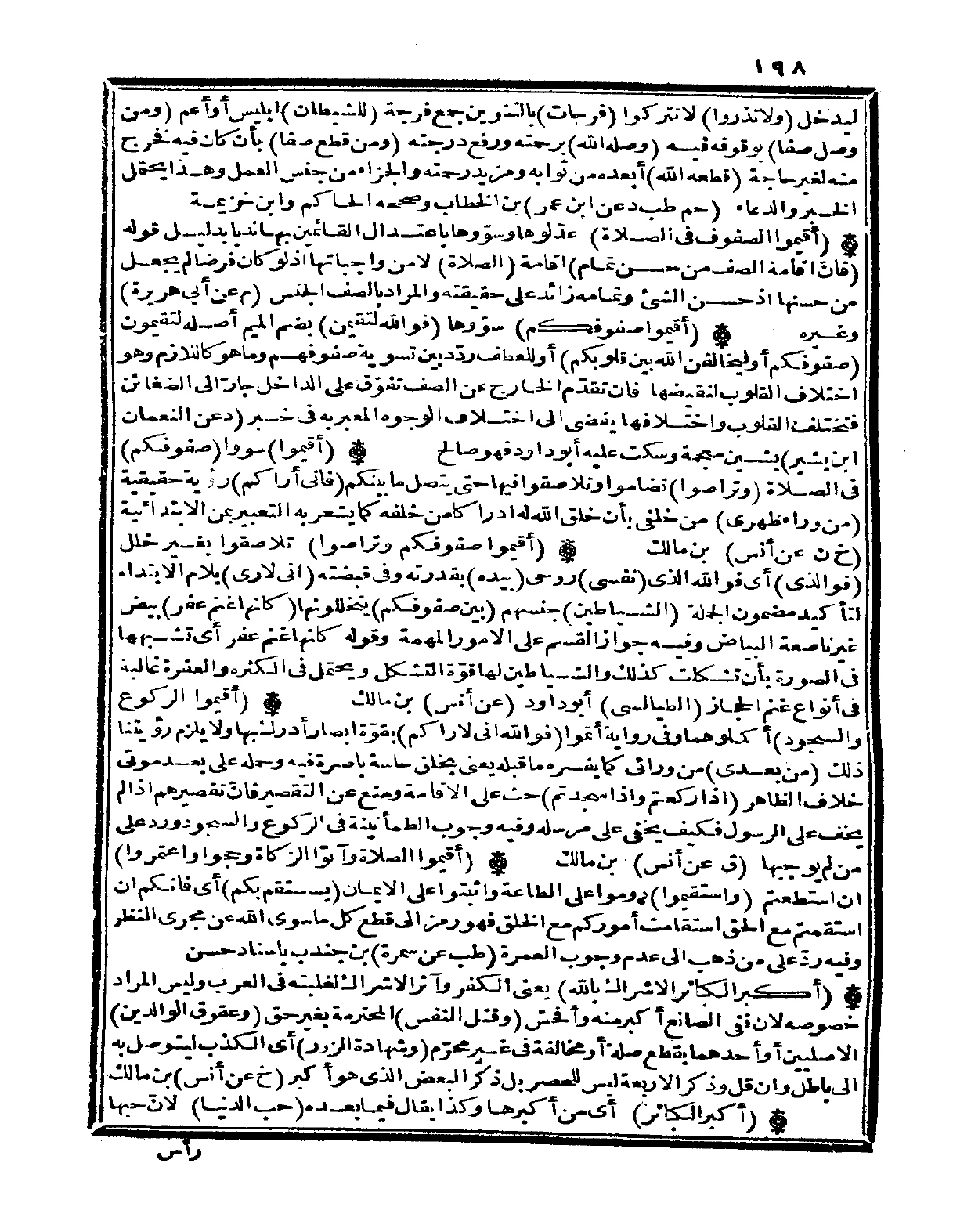 (أقِيمُوا صفوفكم وتراصوا) تلاصقوا بِغَيْر خلل (فوالذي) أَي فوَاللَّه الَّذِي (نَفسِي) روحي (بِيَدِهِ) بقدرته وَفِي قَبضته (إِنِّي لأرى) بلام الِابْتِدَاء لتأكيد مَضْمُون الْجُمْلَة (الشَّيَاطِين) جنسهم (بَين صفوفكم) يتخللونها (كَأَنَّهَا غنم عفر) بيض غير ناصعة الْبيَاض وَفِيه جَوَاز الْقسم على الْأُمُور المهمة وَقَوله كَأَنَّهَا غنم عفر أَي تشبهها فِي الصُّورَة بِأَن تشكلت كَذَلِك وَالشَّيَاطِين لَهَا قوّة التشكل وَيحْتَمل فِي الْكَثْرَة والعفرة غالبة فِي أَنْوَاع غنم الْحجاز (الطَّيَالِسِيّ) أَبُو دَاوُد (عَن أنس) بن مَالك