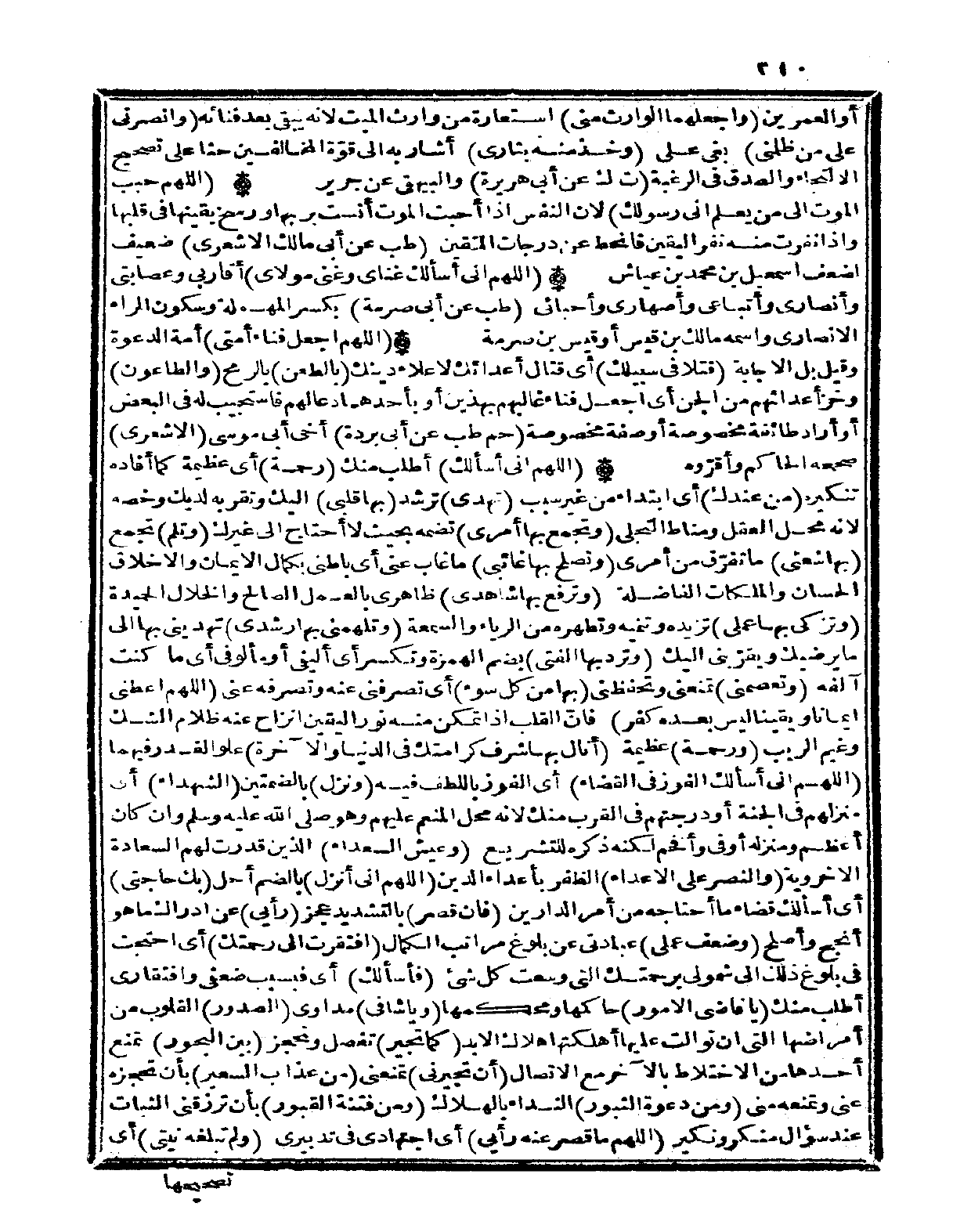 (اللَّهُمَّ إِنِّي أَسأَلك) أطلب مِنْك (رَحْمَة) أَي عَظِيمَة كَمَا أَفَادَهُ تنكيره (من عنْدك) أَي ابْتِدَاء مِمَّن غير سَبَب (تهدي) ترشد (بهَا قلبِي) إِلَيْك وتقربه لديك وَخَصه لِأَنَّهُ مَحل الْعقل ومناط التجلي (وَتجمع بهَا أَمْرِي) تضمه بِحَيْثُ لَا أحتاج إِلَى غَيْرك (وتلم) تجمع (بهَا شعثي) مَا تفرّق من أَمْرِي (وَتصْلح بهَا غائبي) مَا غَابَ عني أَي باطني بِكَمَال الْإِيمَان والأخلاق الحسان والملكات الفاضلة (وترفع بهَا شَاهِدي) ظاهري بِالْعَمَلِ الصَّالح والخلال الحميدة (وتزكي بهَا عَمَلي) تزيده وتنميه وتطهره من الرِّيَاء والسمعة (وتلهمني بهَا رشدي) تهديني بهَا إِلَى مَا يرضيك ويقرّبني إِلَيْك (وَترد بهَا ألفتي) بِضَم الْهمزَة وتكسر أَي أليفي أَو مألوفي أَي مَا كنت آلفه (وتعصمني) تمنعني وتحفظني (بهَا من كل سوء) أَي تصرفني عَنهُ وتصرفه عني (اللَّهُمَّ أَعْطِنِي إِيمَانًا ويقينا لَيْسَ بعده كفر) فإنّ الْقلب إِذا تمكن مِنْهُ نور الْيَقِين انزاح عَنهُ ظلام الشَّك وغيم الريب (وَرَحْمَة) عَظِيمَة (أنال بهَا شرف كرامتك فِي الدُّنْيَا وَالْآخِرَة) علو الْقدر فيهمَا (اللَّهُمَّ إِنِّي أَسأَلك الْفَوْر فِي الْقَضَاء) أَي الْفَوْز باللطف فِيهِ (وَنزل) بالضمتين (الشُّهَدَاء) أَي منزلهم فِي الْجنَّة أَو درجتهم فِي الْقرب مِنْك لِأَنَّهُ مَحل الْمُنعم عَلَيْهِم وَهُوَ وَإِن كَانَ أعظم ومنزله أوفى وأفخم لكنه ذكره للتشريع (وعيش السُّعَدَاء) الَّذين قدرت لَهُم السَّعَادَة الأخروية (والنصر على الْأَعْدَاء) الظفر بأعداء الدّين (اللَّهُمَّ إِنِّي أنزل) بِالضَّمِّ أحل (بك حَاجَتي) أَي أَسأَلك قَضَاء مَا أحتاجه من أَمر الدَّاريْنِ (فَإِن قصر) بِالتَّشْدِيدِ عجز (رَأْيِي) عَن إِدْرَاك مَا هُوَ أنجح وَأصْلح (وَضعف عَمَلي) عبادتي عَن بُلُوغ مَرَاتِب الْكَمَال (افْتَقَرت إِلَى رحمتك) أَي احتجت فِي بُلُوغ ذَلِك إِلَى شمولي بِرَحْمَتك الَّتِي وسعت كل شَيْء (فأسألك) أَي فبسب ضعْفي وافتقاري أطلب مِنْك (يَا قَاضِي الْأُمُور) حاكمها ومحكمها (وَيَا شافي) مداوي (الصُّدُور) الْقُلُوب من أمراضها الَّتِي إِن توالت عَلَيْهَا أهلكتها هَلَاك الْأَبَد (كَمَا تجير) تفصل وتحجز (بَين البحور) تمنع أَحدهَا من الِاخْتِلَاط بِالْآخرِ مَعَ الِاتِّصَال (أَن تجيرني) تمنعني (من عَذَاب السعير) بِأَن تحجزه عني وتمنعه مني (وَمن دَعْوَة الثبور) النداء بِالْهَلَاكِ (وَمن فتْنَة الْقُبُور) بِأَن ترزقني الثَّبَات عِنْد سُؤال مُنكر وَنَكِير (اللَّهُمَّ مَا قصر عَنهُ رَأْيِي) أَي اجتهادي فِي تدبيري (وَلم تبلغه نيتي) أَي