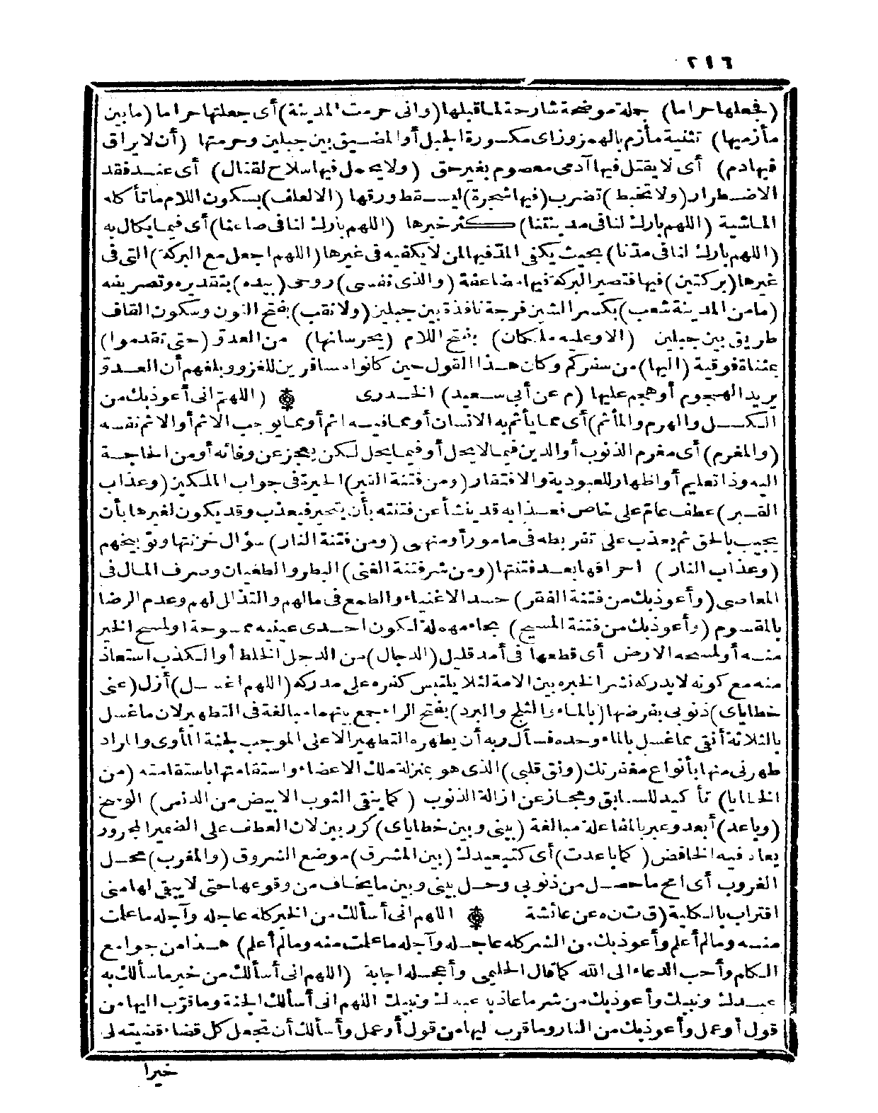 (فَجَعلهَا حَرَامًا) جملَة مُوضحَة شارحة لما قبلهَا (وَإِنِّي حرمت الْمَدِينَة) أَي جَعلتهَا إحراما (مَا بَين مأزميها) تَثْنِيَة مأزم بِالْهَمْز وزاي مَكْسُورَة الْجَبَل أَو الْمضيق بَين جبلين وحرمتها (أَن لَا يراق فِيهَا دم) أَي لَا يقتل فِيهَا آدَمِيّ مَعْصُوم بِغَيْر حق (وَلَا يحمل فِيهَا سلَاح لقِتَال) أَي عِنْد فقد الِاضْطِرَار (وَلَا تخبط) تضرب (فِيهَا شَجَرَة) ليسقط وَرقهَا (إِلَّا لعلف) بِسُكُون اللَّام مَا تَأْكُله الْمَاشِيَة (اللَّهُمَّ بَارك لنا فِي مدينتنا) كثر خَيرهَا (اللَّهُمَّ بَارك لنا يَفِ صاعنا) أَي فِيمَا يُكَال بِهِ (اللَّهُمَّ بَارك لنا فِي مدّنا) بِحَيْثُ يَكْفِي المدّ فِيهَا لمن لَا يَكْفِيهِ فِي غَيرهَا (اللَّهُمَّ اجْعَل مَعَ الْبركَة) الَّتِي فِي غَيرهَا (بركتين) فِيهَا فَتَصِير الْبركَة فِيهَا مضاعفة (وَالَّذِي نَفسِي) روحي (بِيَدِهِ) بتقديره وتصريفه (مَا من الْمَدِينَة شعب) بِكَسْر الشين فُرْجَة نَافِذَة بَين جبلين (وَلَا نقب) بِفَتْح النُّون وَسُكُون الْقَاف طَرِيق بَين جبلين (إِلَّا وَعَلِيهِ ملكان) بِفَتْح اللَّام (يحرسانها) من العدوّ (حَتَّى تقدمُوا) بمثناة فوقية (إِلَيْهَا) من سفركم وَكَانَ هَذَا القَوْل حِين كَانُوا مسافرين للغزو وبلغهم أَن العدوّ يُرِيد الهجوم (أَو هجم عَلَيْهَا (م عَن أبي سعيد) الْخُدْرِيّ