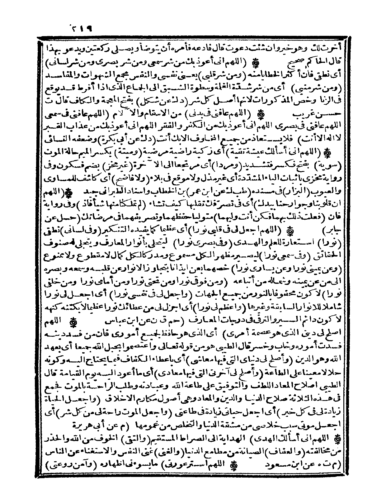 (اللَّهُمَّ اجْعَل لي فِي قلبِي نورا) أَي عَظِيما كَمَا يفِيدهُ التنكير (وَفِي لساني) نطقي (نورا) اسْتِعَارَة للْعلم وَالْهدى (وَفِي بَصرِي نورا) ليتحلى بأنوار المعارف ويتجلى لَهُ صنوف الْحَقَائِق (وَفِي سَمْعِي نورا) ليصير مظهر الْكل مسموع ومدركا لكل كَمَال لَا مَقْطُوع وَلَا مَمْنُوع (وَعَن يَمِيني نورا وَعَن يساري نورا) خصهما بعن إِيذَانًا بتجاوز الْأَنْوَار عَن قلبه وسَمعه وبصره إِلَى من عَن يَمِينه وشماله من أَتْبَاعه (وَمن فَوقِي نورا وَمن تحتي نورا وَمن أَمَامِي نورا وَمن خَلْفي نورا) لأَكُون محفوفا بِالنورِ من جَمِيع الْجِهَات (وَاجعَل لي فِي نَفسِي نورا) أَي اجْعَل لي نورا شَامِلًا للأنوار السَّابِقَة وَغَيرهَا (وَأعظم لي نورا) أَي اجزل لي من عطائك نورا عَظِيما لَا يكتنه كنهه لأَكُون دَائِم السّير والترقي فِي دَرَجَات المعارف (حم ق ن عَن ابْن عَبَّاس