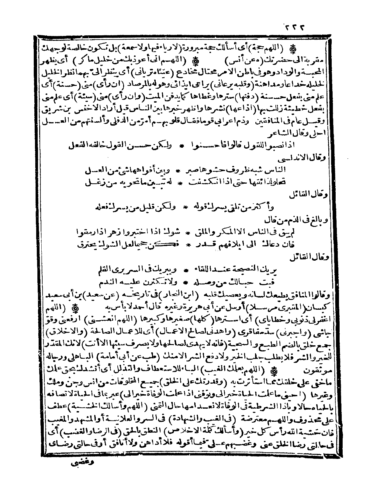 (اللَّهُمَّ أَنِّي أعوذ بك من خَلِيل ماكر) أَي يظْهر الْمحبَّة والوداد وَهُوَ فِي بَاطِن الْأَمر محتال مخادع (عَيناهُ ترياني) أَي ينظر إليّ بهما نظر الْخَلِيل لخليله خداعا ومداهنة (وَقَلبه يرعاني) يُرَاعِي إيذائي وَهُوَ لَهُ بالمرصاد (ان رأى) مني (حَسَنَة) أَي علم مني بِفعل حَسَنَة (دَفنهَا) سترهَا وغطاها كَمَا يدْفن الْمَيِّت (وَإِن رأى) مني (سَيِّئَة) أَي علم مني بِفعل خَطِيئَة زللت بهَا (أذاعها) نشرها وَأظْهر خَبَرهَا بَين النَّاس قيل أَرَادَ الْأَخْنَس بن شريق وَقيل عَام فِي الْمُنَافِقين وذم أَعْرَابِي قوما فَقَالَ قُلُوبهم أمرّ من الدفلي وألسنتهم من الْعَسَل أحلى وَقَالَ الشَّاعِر