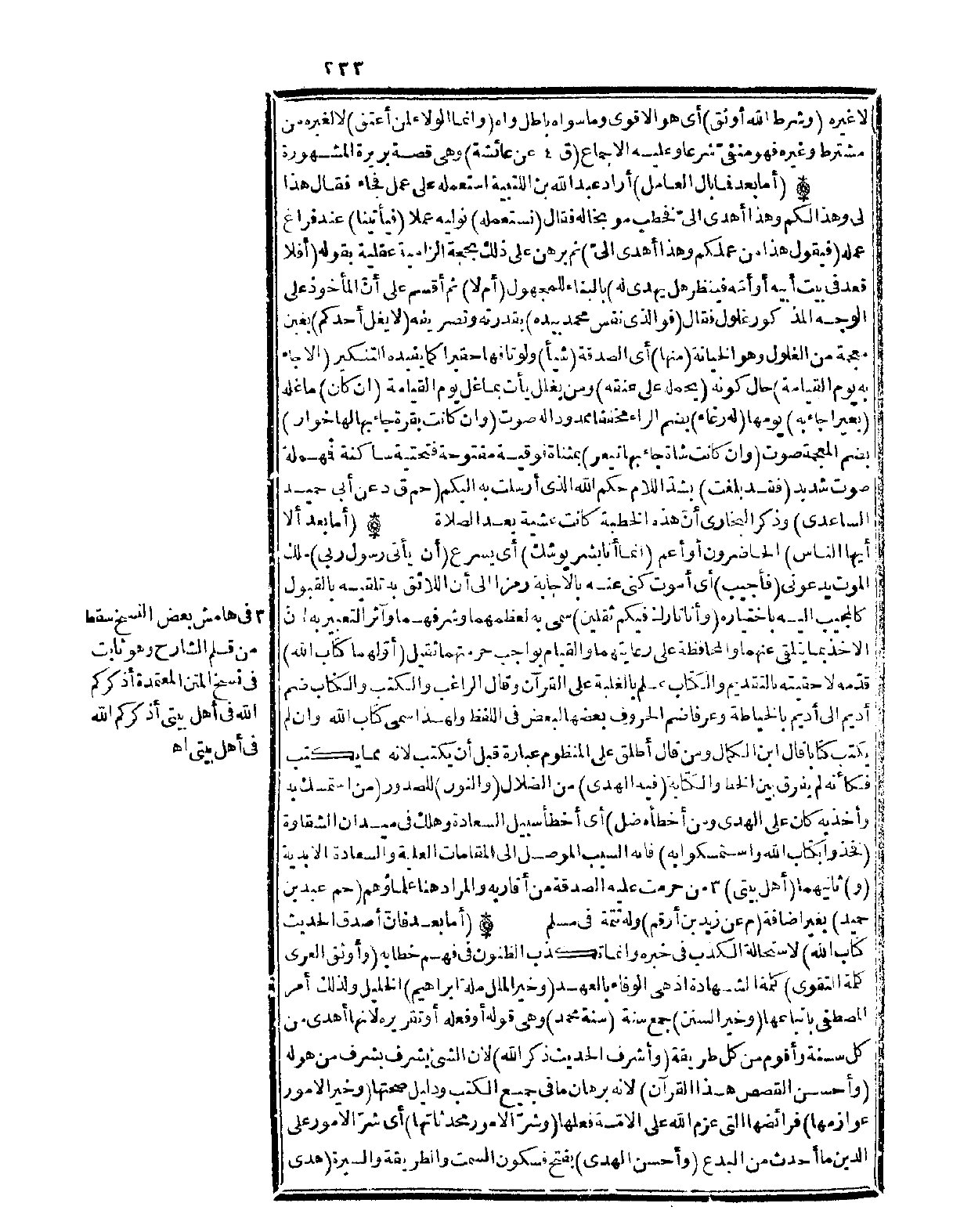 (أما بعد فإنّ أصدق الحَدِيث كتاب الله) لِاسْتِحَالَة الْكَذِب فِي خَبره وَإِنَّمَا تكذب الظنون فِي فهم خطابه (وأوثق العرى كلمة التَّقْوَى) كلمة الشَّهَادَة إِذْ هِيَ الْوَفَاء بالعهد (وَخير الْملَل مِلَّة إِبْرَاهِيم) الْخَلِيل وَلذَلِك أَمر الْمُصْطَفى باتباعها (وَخير السّنَن) جمع سنة (سنة مُحَمَّد) وَهِي قَوْله أَو فعله أَو تَقْرِيره لِأَنَّهَا أهْدى من كل سنة وأقوم من كل طَريقَة (وأشرف الحَدِيث ذكر الله) لِأَن الشَّيْء يشرف بشرف من هُوَ لَهُ (وَأحسن الْقَصَص هَذَا الْقُرْآن) لِأَنَّهُ برهَان مَا فِي جَمِيع الْكتب وَدَلِيل صِحَّتهَا (وَخير الْأُمُور عوازمها) فرائضها الَّتِي عزم الله على الأمّة فعلهَا (وشرّ الْأُمُور محدثاتها) أَي شرّ الْأُمُور على الدّين مَا أحدث من الْبدع (وَأحسن الْهَدْي) بِفَتْح فَسُكُون السمت والطريقة والسيرة (هدي
