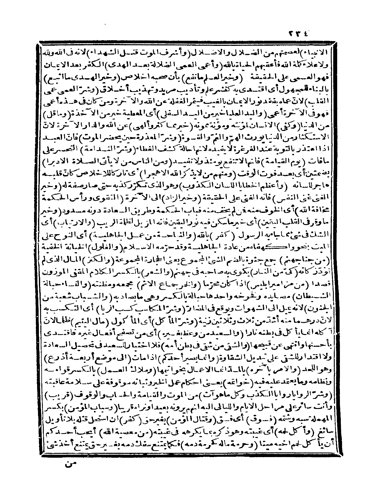 الْأَنْبِيَاء) لعصمتهم من الضلال والإضلال (وأشرف الْمَوْت قتل الشُّهَدَاء) لِأَنَّهُ فِي الله وَللَّه ولإعلاء كلمة الله فأعقبهم الْحَيَاة بِاللَّه (وأعمى الْعَمى الضَّلَالَة بعد الْهدى) الْكفْر بعد الْإِيمَان فَهُوَ الْعَمى على الْحَقِيقَة (وَخير الْعلم مَا نفع) بِأَن صَحبه إخلاص (وَخير الْهَدْي مَا اتبع) بِالْبِنَاءِ للْمَجْهُول أَي اقْتدى بِهِ كنشر علم وتأديب مُرِيد وتهذيب أَخْلَاق (وشرّ الْعَمى عمى الْقلب) لأنّ عماه بفقد نور الْإِيمَان بِالْغَيْبِ فيثمر الْغَفْلَة عَن الله وَالْآخِرَة وَمن كَانَ فِي هَذِه أعمى فَهُوَ فِي الْآخِرَة أعمى (وَالْيَد الْعليا خير من الْيَد السُّفْلى) أَي المعطية خير من الآخذة (وَمَا قل) من الدُّنْيَا (وَكفى) الْإِنْسَان لمؤنته وَمؤنَة ممونه (خير مِمَّا كثر وألهى) عَن الله وَالدَّار الْآخِرَة لأنّ الاستكثار من الدُّنْيَا يُورث الهمّ والغمّ وَالْقَسْوَة (وشرّ المعذرة حِين يحضر الْمَوْت) فإنّ العَبْد إِذا اعتذر بِالتَّوْبَةِ عِنْد الغرغرة لَا يفِيدهُ لانها حَالَة كشف الغطاء (وَشر الندامة) التحسر على مافات (يَوْم الْقِيَامَة) فانها لَا تَنْفَع يَوْمئِذٍ وَلَا تفِيد (وَمن النَّاس من لَا يَأْتِي الصَّلَاة إِلَّا دبرا) بِضَمَّتَيْنِ أَي بعد فَوت الْوَقْت (وَمِنْهُم من لَا يذكر الله إِلَّا هجرا) أَي تَارِكًا للإخلاص كأنّ قلبه هَاجر لِلِسَانِهِ (وَأعظم الْخَطَايَا اللِّسَان الكذوب) وَهُوَ الَّذِي تكرّر كذبه حَتَّى صَار صفة لَهُ (وَخير الْغنى غنى النَّفس) فَإِنَّهُ الْغنى على الْحَقِيقَة (وَخير الزَّاد) إِلَى الْآخِرَة (التَّقْوَى وَرَأس الْحِكْمَة مَخَافَة الله) أَي الْخَوْف مِنْهُ فَمن لم يخف مِنْهُ فباب الْحِكْمَة وَطَرِيق السَّعَادَة دونه مسدود (وَخير مَا وقر فِي الْقلب الْيَقِين) أَي خير مَا سكن فِيهِ نور الْيَقِين فَإِنَّهُ المزيل لظلمة الريب (والارتياب) أَي الشَّك فِي شَيْء مِمَّا جَاءَ بِهِ الرَّسُول (كفر) بِاللَّه (والنياحة من عمل الْجَاهِلِيَّة) أَي النوح على الْمَيِّت بِنَحْوِ واكهفاه من عَادَة الْجَاهِلِيَّة وَقد حرّمه الْإِسْلَام (والغلول) الْخِيَانَة الْخفية (من جثا جَهَنَّم) جمع جثوَة بِالضَّمِّ الشَّيْء الْمَجْمُوع يَعْنِي الْحِجَارَة الْمَجْمُوعَة (والكنز) المَال الَّذِي لم تؤدّ زَكَاته (كيّ من النَّار) يكوى بِهِ صَاحبه فِي جَهَنَّم (وَالشعر) بِالْكَسْرِ الْكَلَام المقفى الْمَوْزُون قصدا (من مَزَامِير إِبْلِيس) إِذا كَانَ محرّما (وَالْخمر جماع الْإِثْم) مجمعه ومظنته (وَالنِّسَاء حبالة الشَّيْطَان) مصايده وفخوخه وَاحِدهَا حبالة بِالْكَسْرِ وَهِي مَا يصاد بِهِ (والشباب شُعْبَة من الْجُنُون) لِأَنَّهُ يمِيل إِلَى الشَّهَوَات ويوقع فِي المضارّ (وشرّ المكاسب كسب الرِّبَا) أَي التكسب بِهِ لأنّ درهما مِنْهُ أشدّ من ثَلَاث وَثَلَاثِينَ زنية (وشرّ المأكل) أَي الْمَأْكُول (مَال الْيَتِيم) ظلما لأنّ آكله إِنَّمَا يَأْكُل فِي بَطْنه نَارا (والسعيد من وعظ بِغَيْرِهِ) أَي من تصفح أَفعَال غَيره فاقتدى بأحسنها وانْتهى عَن قبيحها (والشقي من شقي فِي بطن أمه) فَلَا اخْتِيَار للسعيد فِي تَحْصِيل السَّعَادَة وَلَا اقتدار للشقي على تَبْدِيل الشقاوة (وَإِنَّمَا يصير أحدكُم) إِذا مَاتَ (إِلَى مَوضِع أَرْبَعَة أَذْرع) وَهُوَ اللَّحْد (وَالْأَمر بِآخِرهِ) بالمدّ إِنَّمَا الْأَعْمَال بخواتيمها (وملاك الْعَمَل) بِالْكَسْرِ قوامه ونظامه وَمَا يعْتَمد عَلَيْهِ فِيهِ (خواتمه) يَعْنِي أَحْكَام عمل الْخَيْر وثباته مَوْقُوفَة على سَلامَة عاقبته (وشرّ الروايا روايا الْكَذِب وكل مَا هُوَ آتٍ) من الْمَوْت وَالْقِيَامَة والحساب وَالْوُقُوف (قريب) وَأَنت سَائِر على مراحل الْأَيَّام والليالي إِلَيْهِ أَنهم يرونه بعيد أَو نرَاهُ قَرِيبا (وسباب الْمُؤمن) بِكَسْر الْمُهْملَة سبه وشمته (فسوق) أَي فسق (وقتال الْمُؤمن) بِغَي