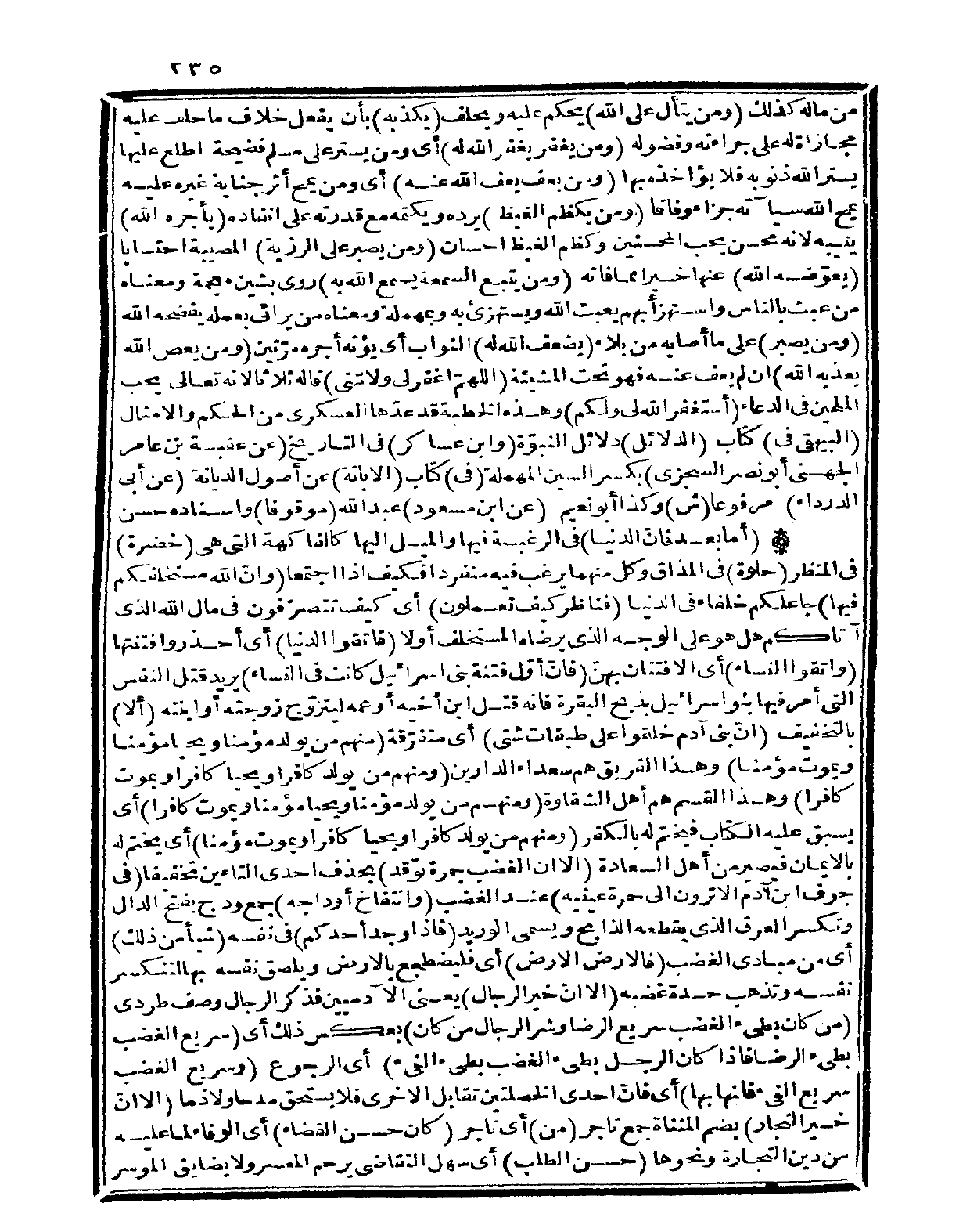(أما بعد فإنّ الدُّنْيَا) فِي الرَّغْبَة فِيهَا والميل إِلَيْهَا كالفاكهة الَّتِي هِيَ (خضرَة) فِي المنظر (حلوة) فِي المذاق وكل مِنْهُمَا يرغب فِيهِ مُنْفَردا فَكيف إِذا اجْتمعَا (وأنّ الله مستخلفكم فِيهَا) جاعلكم خلفاء فِي الدُّنْيَا (فناظر كَيفَ تَعْمَلُونَ) أَي كَيفَ تتصرّفون فِي مَال الله الَّذِي آتَاكُم هَل هُوَ على الْوَجْه الَّذِي يرضاه الْمُسْتَخْلف أَولا (فَاتَّقُوا الدُّنْيَا) أَي أحذروا فتنتها (وَاتَّقوا النِّسَاء) أَي الافتتان بهنّ (فإنّ أوّل فتْنَة بني إِسْرَائِيل كَانَت فِي النِّسَاء) يُرِيد قتل النَّفس الَّتِي أَمر فِيهَا بَنو إِسْرَائِيل بِذبح الْبَقَرَة فَإِنَّهُ قتل ابْن أَخِيه أَو عَمه ليتزوّج زَوجته أَو ابْنَته (أَلا) بِالتَّخْفِيفِ (أنّ بني آدم خلقُوا على طَبَقَات شَتَّى) أَي متفرّقة (مِنْهُم من يُولد مُؤمنا ويحيا مُؤمنا وَيَمُوت مُؤمنا) وَهَذَا الْفَرِيق هم سعداء الدَّاريْنِ (وَمِنْهُم من يُولد كَافِرًا ويحيا كَافِرًا وَيَمُوت كَافِرًا) وَهَذَا الْقسم هم أهل الشقاوة (وَمِنْهُم من يُولد مُؤمنا ويحيا مُؤمنا وَيَمُوت كَافِرًا) أَي يسْبق عَلَيْهِ الْكتاب فيختم لَهُ بالْكفْر (وَمِنْهُم من يُولد كَافِرًا ويحيا كَافِرًا وَيَمُوت مُؤمنا) أَي يخْتم لَهُ بِالْإِيمَان فَيصير من أهل السَّعَادَة (إِلَّا أَن الْغَضَب جَمْرَة توقد) بِحَذْف إِحْدَى التَّاءَيْنِ تَخْفِيفًا (فِي جَوف ابْن آدم أَلا ترَوْنَ إِلَى حمرَة عَيْنَيْهِ) عِنْد الْغَضَب (وانتفاخ أوداجه) جمع ودج بِفَتْح الدَّال وتكسر الْعرق الَّذِي يقطعهُ الذَّابِح وَيُسمى الوريد (فَإِذا وجد أحدكُم) فِي نَفسه (شيأ من ذَلِك) أَي من مبادى الْغَضَب (فالأرض الأَرْض) أَي فليضطجع بِالْأَرْضِ ويلصق نَفسه بهَا لتنكسر نَفسه وَتذهب حِدة غَضَبه (إِلَّا أنّ خير الرِّجَال) يَعْنِي الْآدَمِيّين فَذكر الرِّجَال وصف طردي (من كَانَ بطيء الْغَضَب سريع الرِّضَا وَشر الرِّجَال من كَانَ) بعكس ذَلِك أَي (سريع الْغَضَب بطيء الرِّضَا فَإِذا كَانَ الرجل بطيء الْغَضَب بطيء الْفَيْء) أَي الرُّجُوع (وسريع الْغَضَب سريع الْفَيْء فَإِنَّهَا بهَا) أَي فإنّ إِحْدَى الخصلتين تقَابل الْأُخْرَى فَلَا يسْتَحق مدحا وَلَا ذما (إِلَّا أنّ خير التُّجَّار) بِضَم الْمُثَنَّاة جمع تَاجر (من) أَي تَاجر (كَانَ حسن الْقَضَاء) أَي الْوَفَاء لما عَلَيْهِ من دين التِّجَارَة وَنَحْوهَا (حسن الطّلب) أَي سهل التقاضي يرحم الْمُعسر وَلَا يضايق الْمُوسر