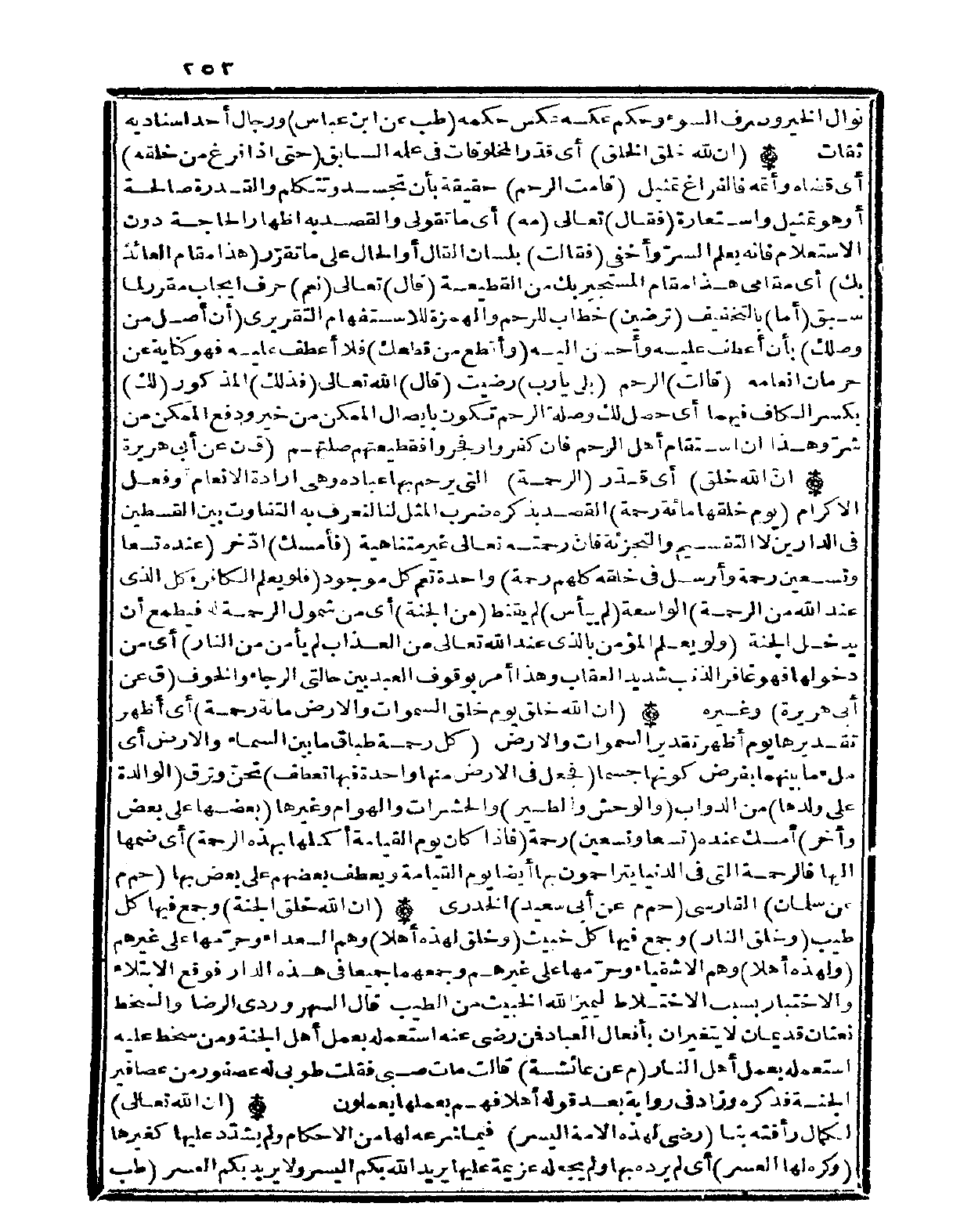 (إنّ الله خلق) أَي قدّر (الرَّحْمَة) الَّتِي يرحم بهَا عباده وَهِي إِرَادَة الْأَنْعَام وَفعل الْإِكْرَام (يَوْم خلقهَا مائَة رَحْمَة) الْقَصْد بِذكرِهِ ضرب الْمثل لنا لنعرف بِهِ التَّفَاوُت بَين القسطين فِي الدَّاريْنِ لَا التَّقْسِيم والتجزئة فإنّ رَحمته تَعَالَى غير متناهية (فَأمْسك) ادّخر (عِنْده تسعا وَتِسْعين رَحْمَة وَأرْسل فِي خلقه كلهم رَحْمَة) وَاحِدَة تعم كل مَوْجُود (فَلم يعلم الْكَافِر بِكُل الَّذِي عِنْد الله من الرَّحْمَة) الواسعة (لم ييأس) لم يقنط (من الْجنَّة) أَي من شُمُول الرَّحْمَة لَهُ فيطمع أَن يدْخل الْجنَّة (وَلَو يعلم الْمُؤمن بِالَّذِي عِنْد الله تَعَالَى من الْعَذَاب لم يَأْمَن من النَّار) أَي من دُخُولهَا فَهُوَ غَافِر الذَّنب شَدِيد الْعقَاب وَهَذَا أَمر بوقوف العَبْد بَين حالتي الرَّجَاء وَالْخَوْف (ق عَن أبي هُرَيْرَة) وَغَيره