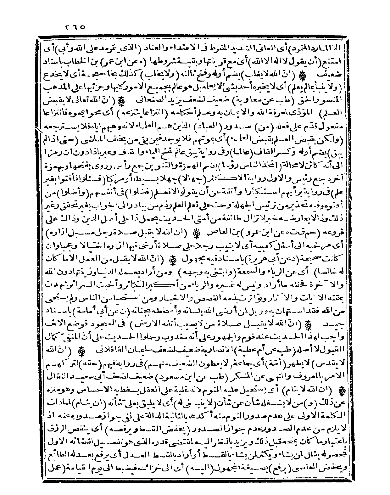 (أنّ الله تَعَالَى لَا يقبض الْعلم) المؤدّي لمعْرِفَة الله وَالْإِيمَان بِهِ وَعلم أَحْكَامه (انتزاعا ينتزعه) أَي محوا يمحوه فانتزاعا مفعول قدّم على فعله (من) صُدُور (الْعباد) الَّذين هم الْعلمَاء لِأَنَّهُ وهبهم إِيَّاه فَلَا يسترجعه (وَلَكِن يقبض الْعلم بِقَبض الْعلمَاء) أَي بموتهم فَلَا يُوجد فِيمَن بَقِي من يخلف الْمَاضِي (حَتَّى إِذا لم يبْق) بِضَم أَوله وَكسر الْقَاف (عَالما) وَفِي رِوَايَة يبْق عَالم بِفَتْح الْيَاء وَالْقَاف وَعبر بإذا دون أَن رمزا إِلَى أَنه كَائِن لَا محَالة (اتخذ النَّاس رؤسا) بِضَم الْهمزَة والتنوين جمع رَأس وروى بِفَتْحِهَا وبهمزة آخِره جمع رَئِيس وَالْأول رِوَايَة الْأَكْثَر (جُهَّالًا) جهلا بسيطا أَو مركبا (فسئلوا فأفتوا بِغَيْر علم) فِي رِوَايَة برأيهم استكبارا وأنفة عَن أَن يَقُولُوا لَا نعلم (فضلوا) فِي أنفسهم (وأضلوا) من أفنوه وَفِيه تحذير من ترئيس الجهلة وحث على تعلم الْعلم وذم من يُبَادر إِلَى الْجَواب بِغَيْر تحقق وَغير ذَلِك وَذَا لَا يُعَارضهُ خبر لَا تزَال طَائِفَة من أمتِي الحَدِيث بِحمْل ذَا على أصل الدّين وَذَاكَ على فروعه (حم ق ت هـ عَن ابْن عَمْرو) بن الْعَاصِ