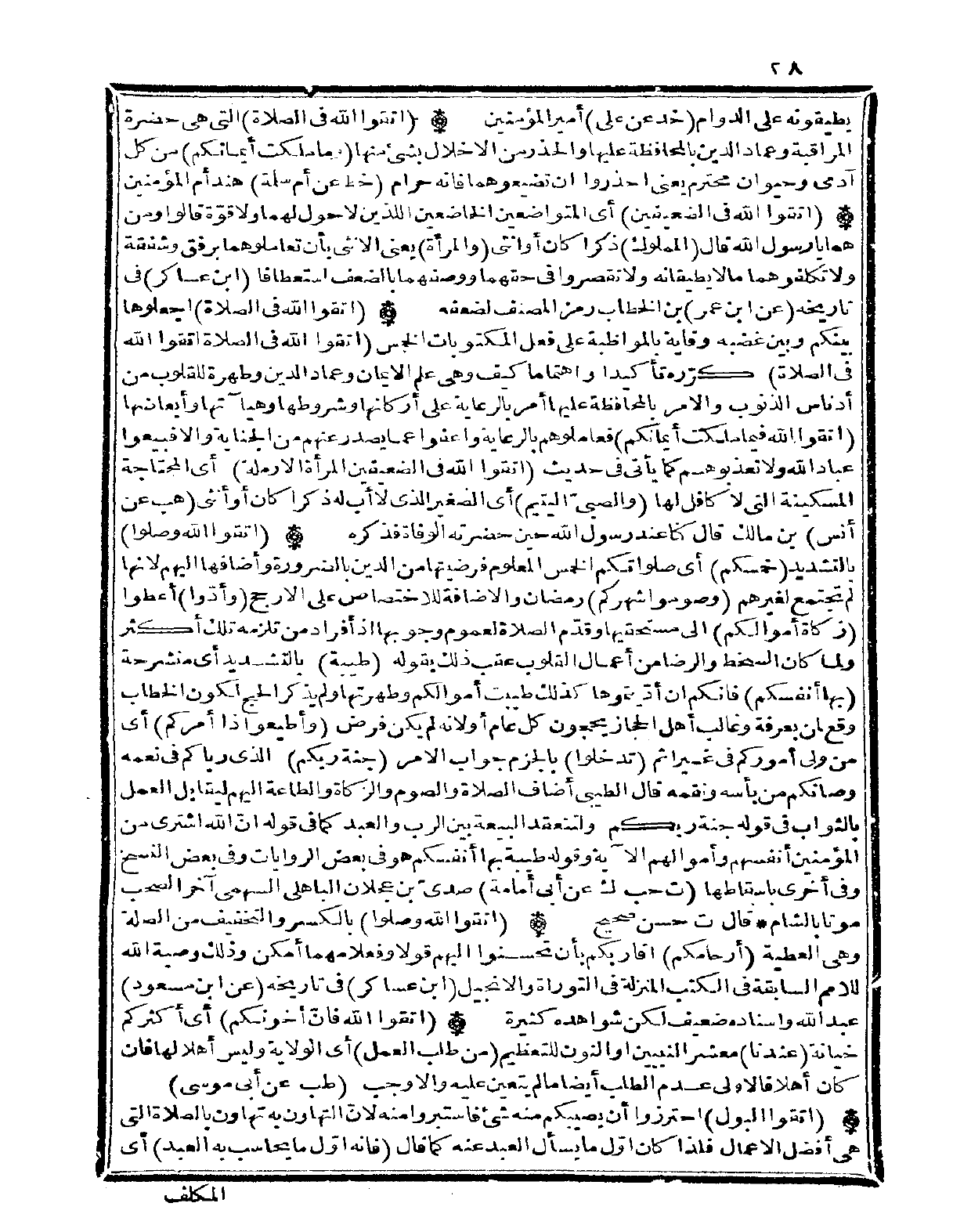 (اتَّقوا الله فِي الصَّلَاة) اجْعَلُوهَا بَيْنكُم وَبَين غَضَبه وقاية بالمواظبة على فعل المكتوبات الْخمس (اتَّقوا الله فِي الصَّلَاة اتَّقوا الله فِي الصَّلَاة) كرّره تَأْكِيدًا واهتماما كَيفَ وَهِي علم الْإِيمَان وعماد الدّين وطهرة للقلوب من أدناس الذُّنُوب وَالْأَمر بالمحافظة عَلَيْهَا أَمر بالرعاية على أَرْكَانهَا وشروطها وهيآتها وأبعاضها (اتَّقوا الله فِيمَا ملكت أَيْمَانكُم) فعاملوهم بالرعاية وَاعْفُوا عَمَّا يصدر عَنْهُم من الْجِنَايَة وَإِلَّا فبيعوا عباد الله وَلَا تعذبوهم كَمَا يَأْتِي فِي حَدِيث (اتَّقوا الله فِي الضعيفين الْمَرْأَة الأرملة) أَي المحتاجة المسكينة الَّتِي لَا كافل لَهَا (والصبيّ الْيَتِيم) أَي الصَّغِير الَّذِي لَا أَب لَهُ ذكرا كَانَ أَو أُنْثَى (هَب عَن أنس) بن مَالك قَالَ كُنَّا عِنْد رَسُول الله حِين حَضرته الْوَفَاة فَذكره