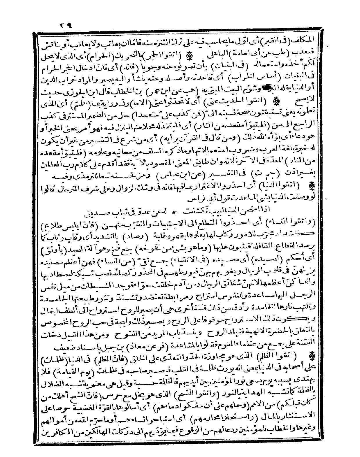 (اتَّقوا الظُّلم) الَّذِي هُوَ مُجَاوزَة الحدّ والتعدّي على الْخلق (فإنّ الظُّلم) فِي الدُّنْيَا (ظلمات) على أَصْحَابه فِي الدُّنْيَا بِمَعْنى أَنه يُورث ظلمَة فِي الْقلب فَيصير صَاحبه فِي ظلمات (يَوْم الْقِيَامَة) فَلَا يَهْتَدِي بِسَبَبِهِ يَوْم يسْعَى نور الْمُؤمنِينَ بَين أَيْديهم فالظلمة حسية وَقيل هِيَ معنوية شبه الضلال بالظلمة كَمَا تشبه الْهِدَايَة بِالنورِ (وَاتَّقوا الشُّح) الَّذِي هُوَ بخل مَعَ حرص (فإنّ الشُّح أهلك من كَانَ قبلكُمْ) من الْأُمَم (وَحَملهمْ على أَن سَفَكُوا دِمَاءَهُمْ) أَي اسألوها بِالْقُوَّةِ الغضبية حرصا على الاستئثار بِالْمَالِ (وَاسْتَحَلُّوا مَحَارِمهمْ) أَي استباحوا نِسَاءَهُمْ أَو مَا حرّم الله من أَمْوَالهم وَغَيرهَا وَالْخطاب للْمُؤْمِنين ردعا لَهُم من الْوُقُوع فِيمَا يؤدّيهم إِلَى دركات الهالكين من الْكَافرين