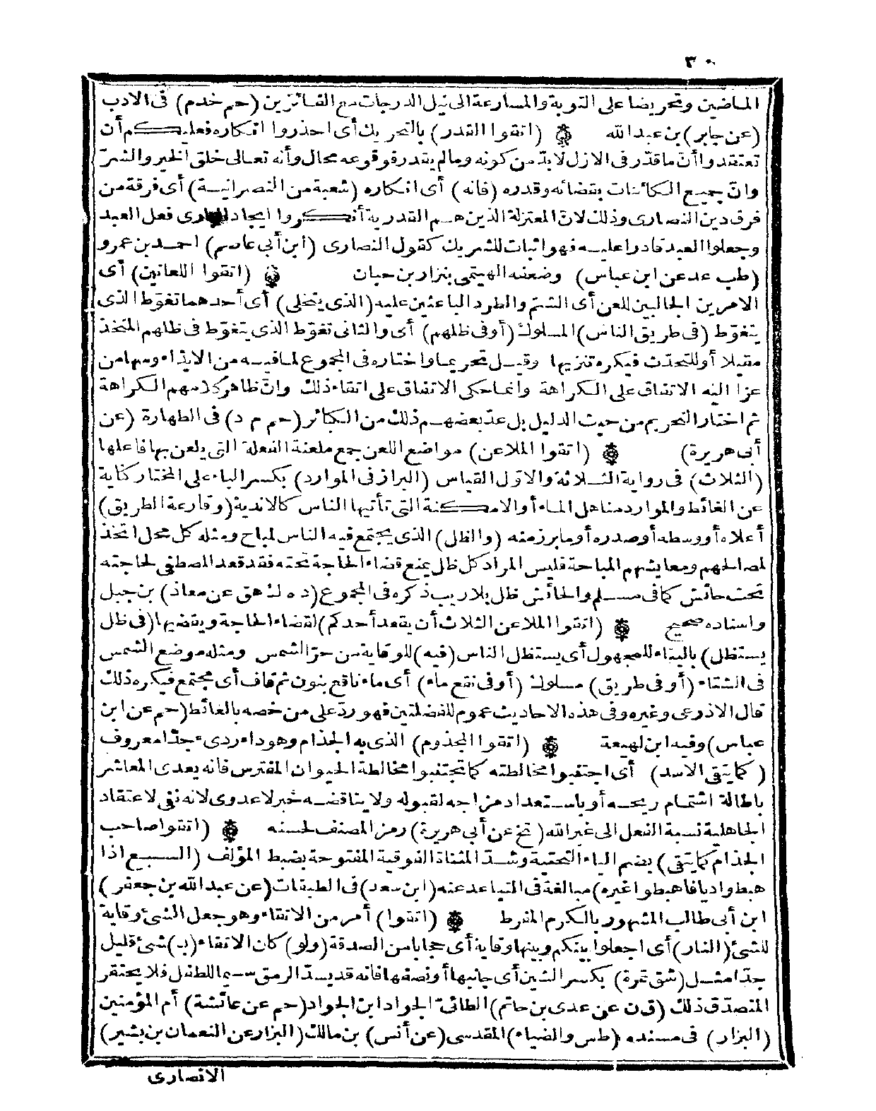 (اتَّقوا الْملَاعن) مَوَاضِع اللَّعْن جمع ملعنة الفعلة الَّتِي يلعن بهَا فاعلها (الثَّلَاث) فِي رِوَايَة الثَّلَاثَة والأوّل الْقيَاس (البرَاز فِي الْمَوَارِد) بِكَسْر الْبَاء على الْمُخْتَار كِنَايَة عَن الْغَائِط والموارد مناهل المَاء أَو الْأَمْكِنَة الَّتِي تأتيها النَّاس كالأندية (وقارعة الطَّرِيق) أَعْلَاهُ أَو وَسطه أَو صَدره أَو مَا برز مِنْهُ (والظل) الَّذِي يجْتَمع فِيهِ النَّاس لمباح وَمثله كل مَحل اتخذ لمصالحهم ومعايشهم الْمُبَاحَة فَلَيْسَ المُرَاد كل ظلّ يمْنَع قَضَاء الْحَاجة تَحْتَهُ فقد قعد الْمُصْطَفى لِحَاجَتِهِ تَحت حائش كَمَا فِي مُسلم والحائش ظلّ بِلَا ريب ذكره فِي الْمَجْمُوع (د هـ ك هق عَن معَاذ) بن جبل وَإِسْنَاده صَحِيح
