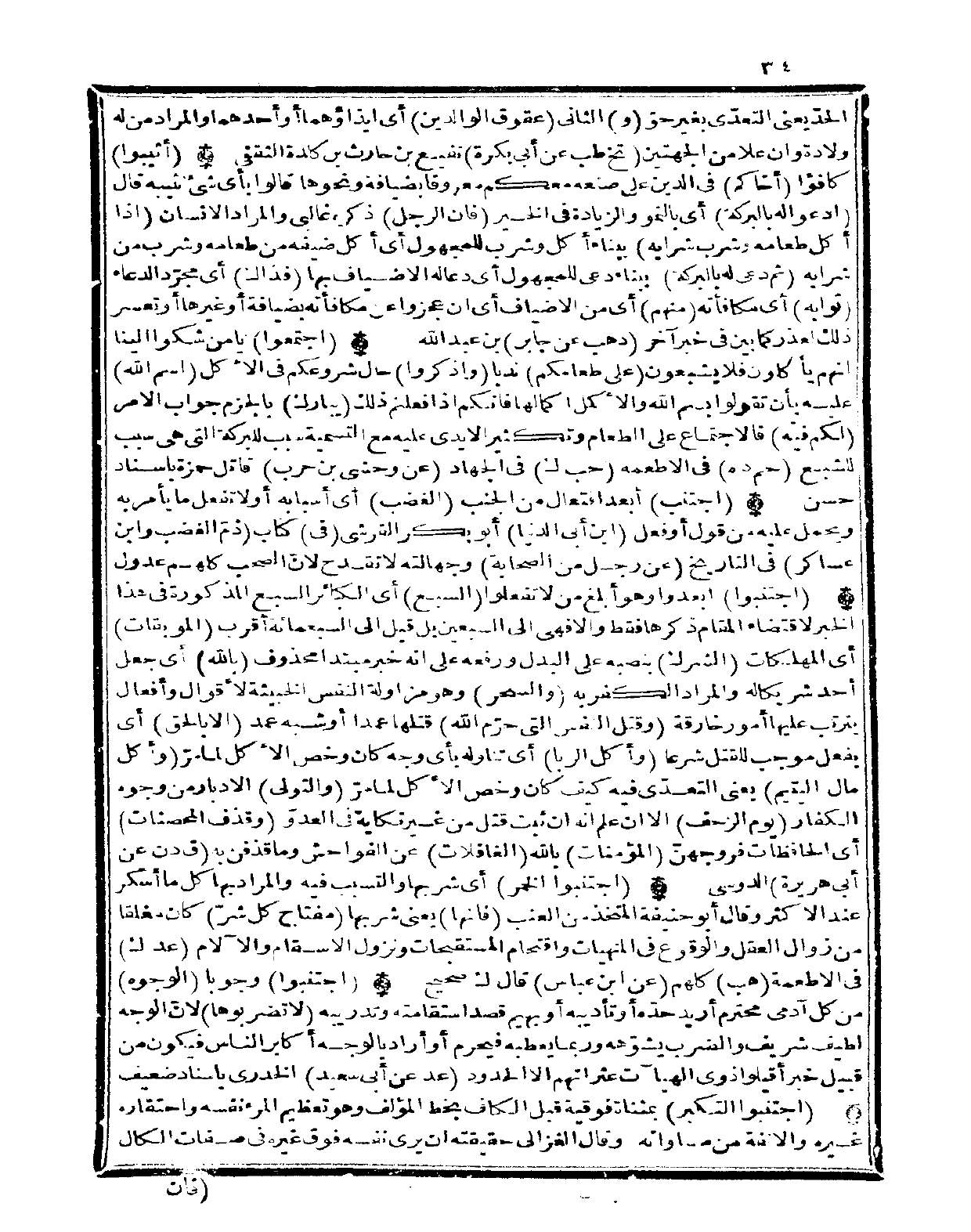 (اجتنبوا) ابعدوا وَهُوَ أبلغ من لَا تَفعلُوا (السَّبع) أَي الْكَبَائِر السَّبع الْمَذْكُور فِي هَذَا الْخَبَر لاقْتِضَاء الْمقَام ذكرهَا فَقَط وَإِلَّا فَهِيَ إِلَى السّبْعين بل قيل إِلَى السبعمائة أقرب (الموبقات) أَي المهلكات (الشّرك) بنصبه على الْبَدَل وَرَفعه على أَنه خبر مُبْتَدأ مَحْذُوف (بِاللَّه) أَي جعل أحد شَرِيكا لَهُ وَالْمرَاد الْكفْر بِهِ (وَالسحر) وَهُوَ مزاولة النَّفس الخبيثة لأقوال وأفعال يَتَرَتَّب عَلَيْهَا أُمُور خارقة (وَقتل النَّفس الَّتِي حرّم الله) قَتلهَا عمدا أَو شبه عمد (إِلَّا بِالْحَقِّ) أَي بِفعل مُوجب للْقَتْل شرعا (وَأكل الرِّبَا) أَي تنَاوله بِأَيّ وَجه كَانَ وَخص الْأكل لما مرّ (وَأكل مَال الْيَتِيم) يَعْنِي التعدّي فِيهِ كَيفَ كَانَ وَخص الْأكل لما مرّ (والتولي) الادبار من وُجُوه الْكفَّار (يَوْم الزَّحْف) إِلَّا إِن علم أَنه إِن ثَبت قتل من غير نكاية فِي العدوّ (وَقذف الْمُحْصنَات) أَي الحافظات فروجهنّ (الْمُؤْمِنَات) بِاللَّه (الْغَافِلَات) عَن الْفَوَاحِش وَمَا قذفن بِهِ (ق د ن عَن أبي هُرَيْرَة) الدوسي