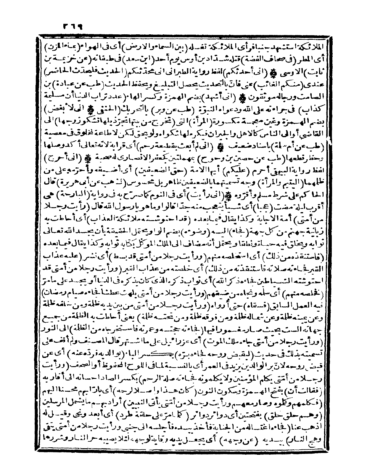 (إِنِّي رَأَيْت) أَي فِي النّوم كَمَا صرح بِهِ فِي رِوَايَة (البارحة) هِيَ أقرب لَيْلَة مضب (عجبا) أَي شيأ يتعجب مِنْهُ جدا قَالُوا وَمَا هُوَ يَا رَسُول الله قَالَ (رَأَيْت رجلا من أمتِي) أمة الأجابة وَكَذَا يُقَال فِيمَا بعده (قد احتوشته مَلَائِكَة الْعَذَاب) أَي أحاطت بِهِ زَبَانِيَة جَهَنَّم من كل جِهَة (فجَاء) إِلَيْهِ (وضوءه) بِضَم الْوَاو يحْتَمل الْحَقِيقَة بِأَن يجسد الله تَعَالَى ثَوَابه ويخلق فِيهِ حَيَاة ونطقا وَيحْتَمل أَنه مُضَاف إِلَى الْملك الْمُوكل بكتابه ثَوَابه وَكَذَا يُقَال فِيمَا بعده (فاستنقذ من ذَلِك) أَي استخلصه مِنْهُم (وَرَأَيْت رجلا من أمتِي قد بسط) أَي نشر (عَلَيْهِ عَذَاب الْقَبْر فَجَاءَتْهُ صلَاته فاستنفذته من ذَلِك) أَي خلصته من عَذَاب الْقَبْر (وَرَأَيْت رجلا من أمتِي قد احتوشته الشَّيَاطِين فَجَاءَهُ ذكر الله) أَي ثَوَاب ذكره الَّذِي كَانَ يذكرهُ فِي الدُّنْيَا أَو يحْسد على مَا مر (فخلصه مِنْهُم) أَي سلمه ونجاه من ضيقهم (وَرَأَيْت رجلا من أمتِي يَلْهَث عطشاً فَجَاءَهُ صِيَام رَمَضَان) فِيهِ الْعَمَل السَّابِق (فَسَقَاهُ) حَتَّى أرواه (وَرَأَيْت رجلا من أمتِي من بَين يَدَيْهِ ظلمَة وَمن خَلفه ظلمَة وَعَن يَمِينه ظلمَة وَعَن شِمَاله ظلمَة وَمن فَوْقه ظلمَة وَمن تَحْتَهُ ظلمَة) يَعْنِي أحاطت بِهِ الظلمَة من جَمِيع جهاته السِّت بِحَيْثُ صَار مغموراً فِيهَا (فَجَاءَتْهُ حجَّته وعمرته فاستخرجاه من الظلمَة) إِلَى النُّور (وَرَأَيْت رجلا من أمتِي جَاءَهُ ملك الْمَوْت) أَي عزرائيل على مَا اشْتهر قَالَ المُصَنّف وَلم أَقف على تَسْمِيَته بذلك فِي حَدِيث (ليقْبض روحه فَجَاءَهُ بره) بِكَسْر الْبَاء (بِوَالِديهِ فَرده عَنهُ) أَي عَن قبض روحه لِأَن بر الْوَالِدين يزِيد فِي الْعُمر أَي بِالنِّسْبَةِ لما فِي اللَّوْح الْمَحْفُوظ أَو الصُّحُف (وَرَأَيْت رجلا من أمتِي يكلم الْمُؤمنِينَ وَلَا يكلمونه فَجَاءَتْهُ صلَة الرَّحِم) بِكَسْر الصَّاد إحسانه إِلَى أَقَاربه (فَقَالَت أَن) بِفَتْح الْهمزَة وَسُكُون النُّون (كَانَ هَذَا واصلاَ لرحمه) أَي بارا بهم محسنا إِلَيْهِم (فَكَلَّمَهُمْ وكلموه وَصَارَ مَعَهم وَرَأَيْت رجلا من أمتِي يَأْتِي النَّبِيين) أَرَادَ بهم مَا يَشْمَل الْمُرْسلين (وهم حلق حلق) بِفتْحَتَيْنِ أَي دوائر دوائر (كلما مر على حَلقَة طرد) أَي أبعد ونحى وَقيل لَهُ اذْهَبْ عَنَّا (فَجَاءَهُ اغتساله من الْجَنَابَة فَأخذ بِيَدِهِ فأجلسه إِلَى جَنْبي وَرَأَيْت رجلا من أمتِي يتقى وهج النَّار) بيدَيْهِ (عَن وَجهه) أَي يَجْعَل يَدَيْهِ وقاية لوجهه لِئَلَّا يُصِيبهُ حر النَّار وشررها