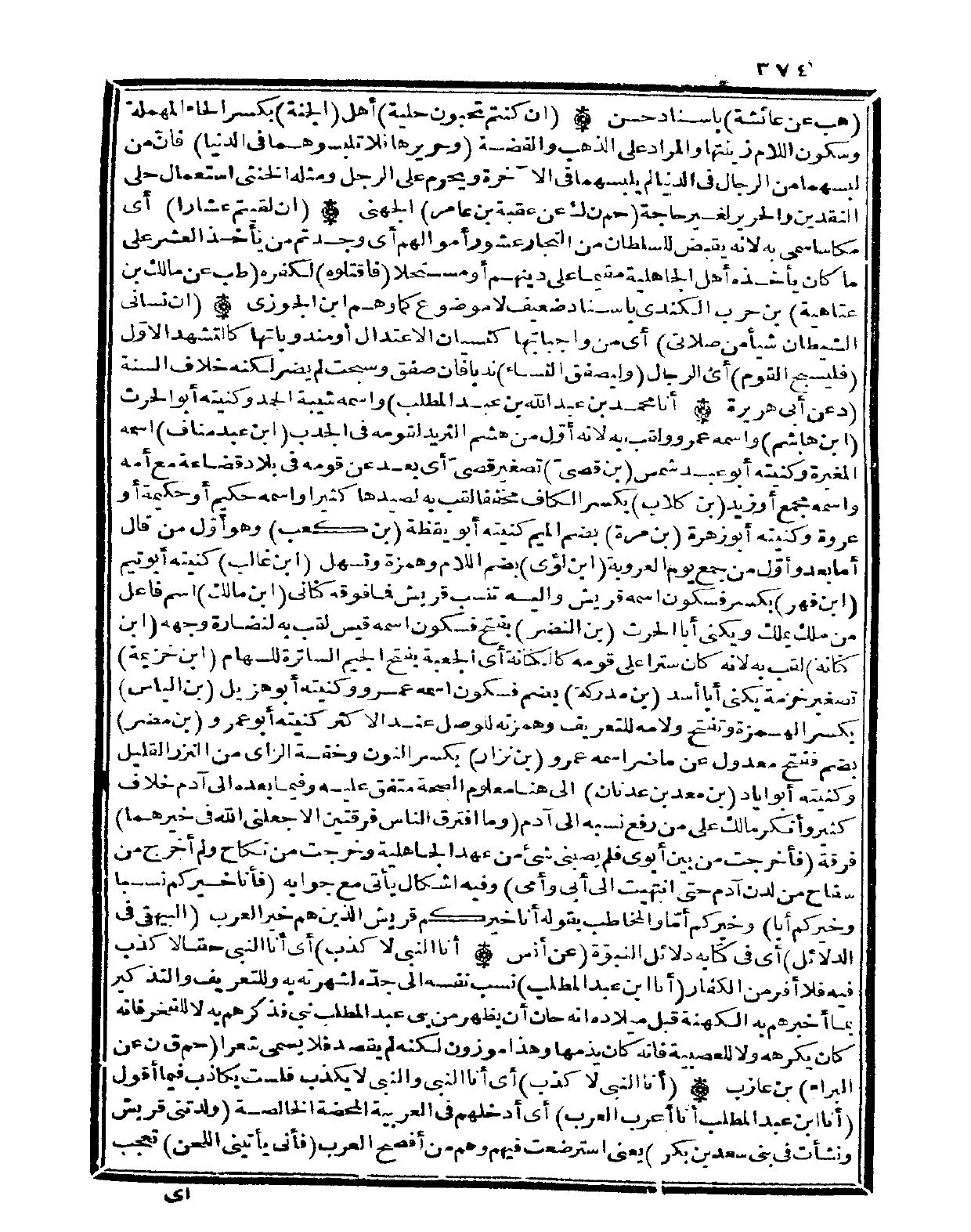 أَنا مُحَمَّد بن عبد الله بن عبد الْمطلب) واسْمه شيبَة الْحَمد وكنيته أَبُو الْحَرْث (ابْن هَاشم) واسْمه عَمْرو ولقب بِهِ لِأَنَّهُ أول من هشم الثَّرِيد لِقَوْمِهِ فِي الجدب (ابْن عبد منَاف) اسْمه الْمُغِيرَهْ وكنيته أَبُو عبد شمس (بن قصي) تَصْغِير قصي أَي بعد عَن قومه فِي بِلَاد قضاعة مَعَ أمه واسْمه مجمع أوزيد (بن كلاب) بِكَسْر الْكَاف مخففا لقب بِهِ لصيدها كثيرا واسْمه حَكِيم أَو حكيمة أَو عُرْوَة وكنيته أَبُو زهرَة (بن مرّة) بِضَم الْمِيم كنيته أَبُو يقظة (بن كَعْب) وَهُوَ أول من قَالَ أما بعد وَأول من جمع يَوْم الْعرُوبَة (ابْن لؤَي) بِضَم اللَّام وهمزة وتسهل (ابْن غَالب) كنيته أَبُو تيم (ابْن فهر) بِكَسْر فَسُكُون اسْمه قُرَيْش وَإِلَيْهِ تنْسب قُرَيْش فَمَا فَوْقه كناني (ابْن مَالك) اسْم فَاعل من ملك يملك ويكنى أَبَا الْحَرْث (بن النَّضر) بِفَتْح فَسُكُون اسْمه قيس لقب بِهِ لنضارة وَجهه (ابْن كنَانَة) لقب بِهِ لِأَنَّهُ كَانَ سترا على قومه كالكنانة أَي الجعبة بِفَتْح الْجِيم الساترة للسهام (ابْن خُزَيْمَة) تَصْغِير خزمة يكنى أَبَا أَسد (بن مدركة) بِضَم فَسُكُون اسْمه عَمْرو وكنيته أَبُو هزيل (بن إلْيَاس) بِكَسْر الْهمزَة وتفتح ولامه للتعريف وهمزته للوصل عِنْد الْأَكْثَر كنيته أَبُو عَمْرو (بن مُضر) بِضَم فَفتح معدول عَن مَا ضرّ اسْمه عَمْرو (بن نزار) بِكَسْر النُّون وخفة الزَّاي من النزر الْقَلِيل وكنيته أَبُو إياد (بن معد بن عدنان) إِلَى هُنَا مَعْلُوم الصِّحَّة مُتَّفق عَلَيْهِ وَفِيمَا بعده إِلَى آدم خلاف كثيرو أنكر مَالك على من رفع نسبه إِلَى آدم (وَمَا افترق النَّاس فرْقَتَيْن إِلَّا جعلني الله فِي خيرهما) فرقة (فأخرجت من بَين أَبَوي فَلم يُصِبْنِي شَيْء من عهد الْجَاهِلِيَّة وَخرجت من نِكَاح وَلم أخرج من سفاح من لدن آدم حَتَّى انْتَهَيْت إِلَى أبي وَأمي) وَفِيه أشكال يَأْتِي مَعَ جَوَابه) فَأَنا خَيركُمْ نسبا وخيركم أَبَا) وخيركم أما والمخاطب بقوله أَنا خَيركُمْ قُرَيْش الَّذين هم خير الْعَرَب (الْبَيْهَقِيّ فِي الدَّلَائِل) أَي فِي كِتَابه دَلَائِل النُّبُوَّة عَن أنس