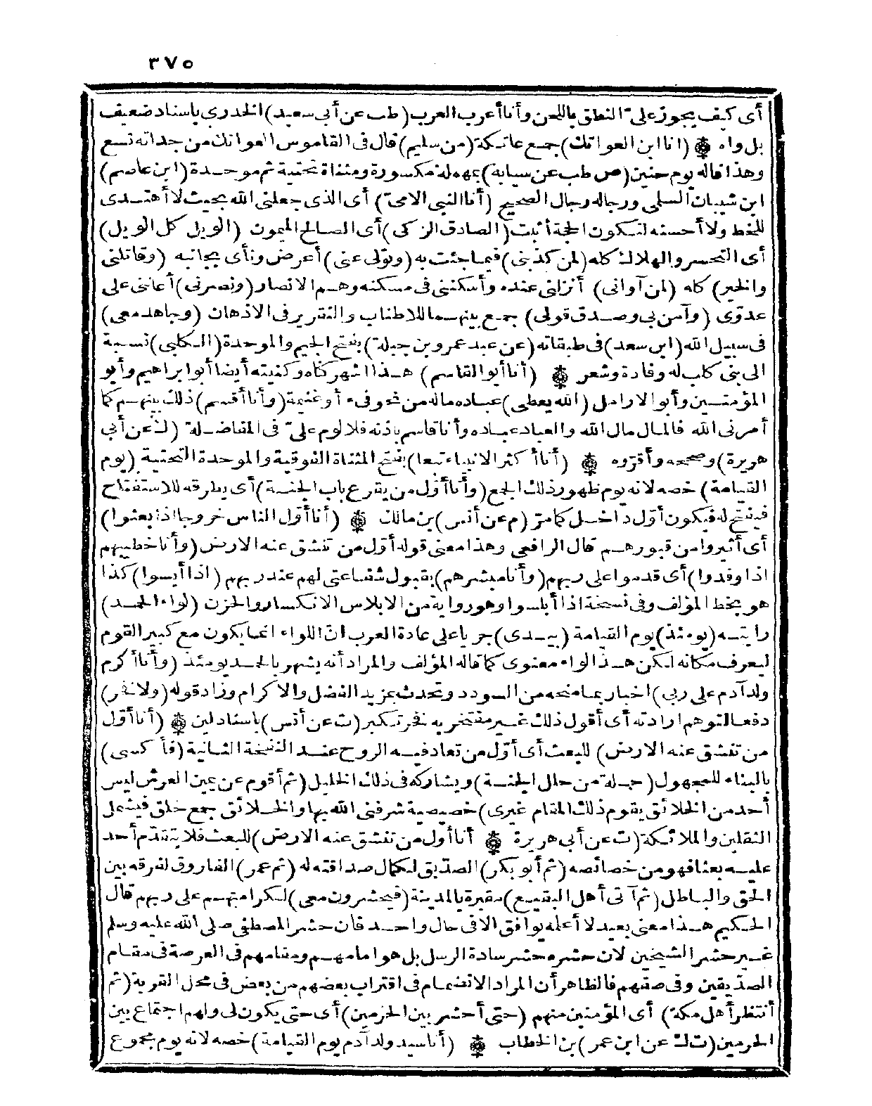 (أَنا أول من تَنْشَق عَنهُ الأَرْض) للبعث أَي أوّل من تُعَاد فِيهِ الرّوح عِنْد النفخة الثَّانِيَة (فأكسى) بِالْبِنَاءِ للْمَجْهُول (حلَّة من حلل الْجنَّة) ويشاركه فِي ذَلِك الْخَلِيل (ثمَّ أقوم عَن يَمِين الْعَرْش لَيْسَ أحد من الْخَلَائق يقوم ذَلِك الْمقَام غَيْرِي) خصيصية شرفني الله بهَا وَالْخَلَائِق جمع خلق فَيشْمَل الثقلَيْن وَالْمَلَائِكَة (ت عَن أبي هُرَيْرَة