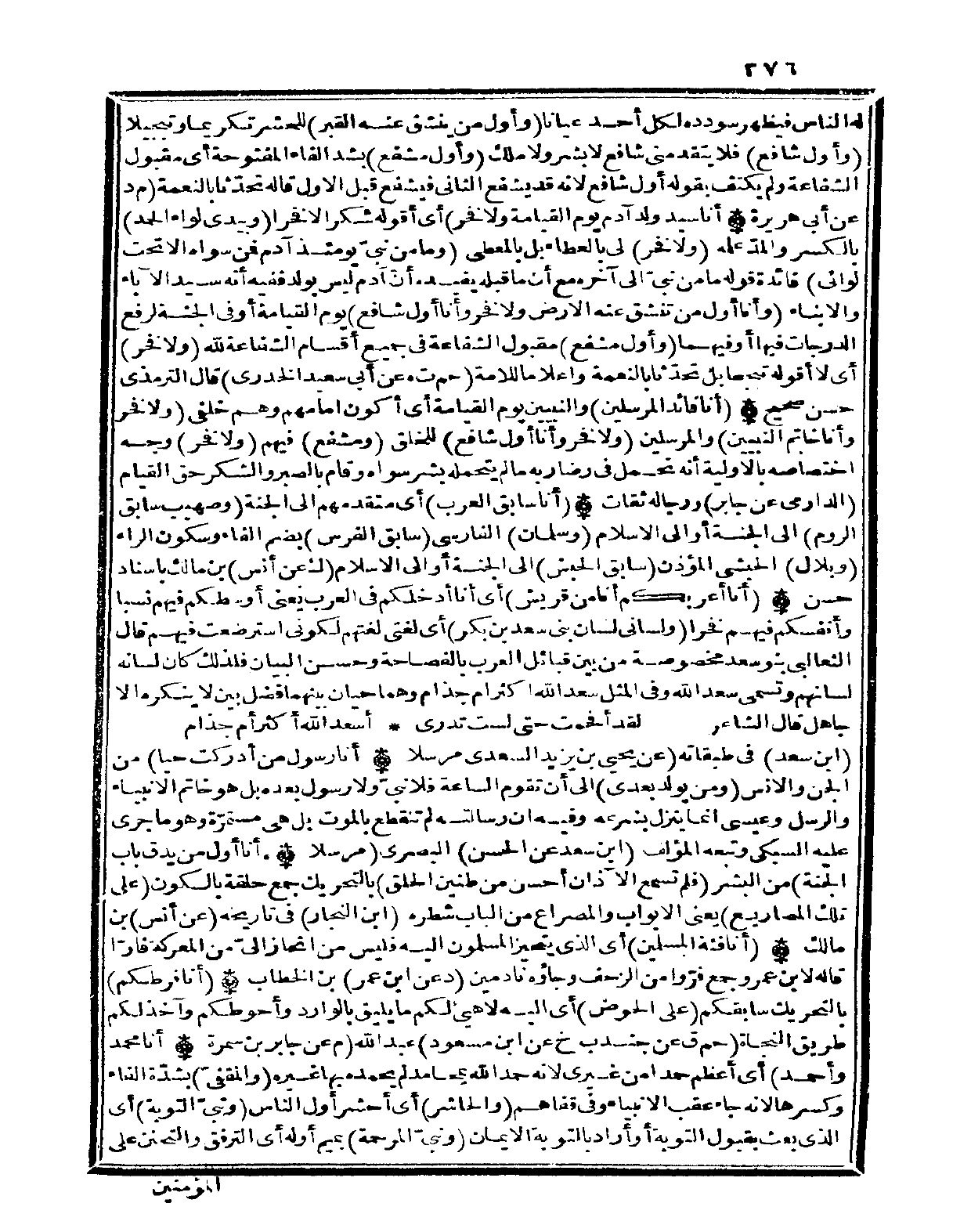 أَنا سيد ولد آدم يَوْم الْقِيَامَة وَلَا فَخر) أَي أقوله شكرا إِلَّا فخراً (وَبِيَدِي لِوَاء الْحَمد) بِالْكَسْرِ والمدّ علمه (وَلَا فَخر) لي بالعطاء بل بالمعطي (وَمَا من نَبِي يَوْمئِذٍ آدم فَمن سواهُ إِلَّا تَحت لِوَائِي) فَائِدَة قَوْله مَا من نَبِي إِلَى آخِره مَعَ أَن مَا قبله يفِيدهُ أَن آدم لَيْسَ بِولد فَفِيهِ أَنه سيد الْآبَاء وَالْأَبْنَاء (وَأَنا أول من تَنْشَق عَنهُ الأَرْض وَلَا فَخر وَأَنا أول شَافِع) يَوْم الْقِيَامَة أَو فِي الْجنَّة لرفع الدَّرَجَات فِيهَا أَو فيهمَا (وَأول مُشَفع) مَقْبُول الشَّفَاعَة فِي جَمِيع أَقسَام الشَّفَاعَة لله (وَلَا فَخر) أَي لَا أقوله تبجحاً بل تحدّثاً بِالنعْمَةِ وإعلاماً للْأمة (حم ت هـ عَن أبي سعيد الْخُدْرِيّ) قَالَ التِّرْمِذِيّ // (حسن صَحِيح) //