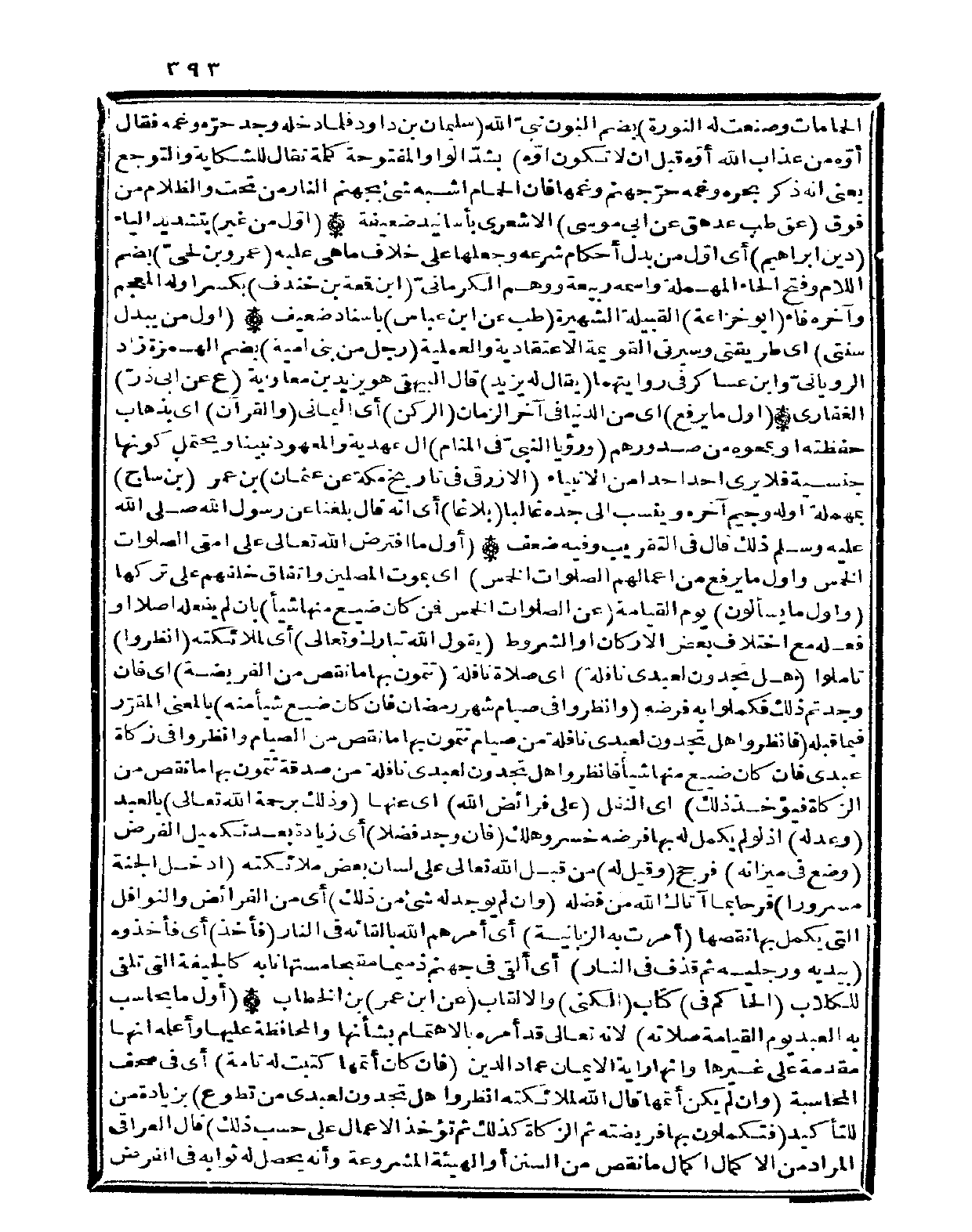 (أول مَا افْترض الله تَعَالَى على أمتِي الصَّلَوَات الْخمس وَأول مَا يرفع من أَعْمَالهم الصَّلَوَات الْخمس) أَي بِمَوْت الْمُصَلِّين واتفاق خَلفهم على تَركهَا (وَأول مَا يسْأَلُون) يَوْم الْقِيَامَة (عَن الصَّلَوَات الْخمس فَمن كَانَ ضيع مِنْهَا شَيْئا) بِأَن لم يَفْعَله أصلا أَو فعله مَعَ اخْتِلَاف بعض الْأَركان أَو الشُّرُوط (يَقُول الله تبَارك وَتَعَالَى) أَي لملائكته (انْظُرُوا) تأملوا (هَل تَجِدُونَ لعبدي نَافِلَة) أى صَلَاة نَافِلَة (تتمون بهَا مَا نقص من الْفَرِيضَة) اى فان وجدْتُم ذَلِك فَكَلَّمُوا بِهِ فَرْضه (وانظروا فِي صِيَام شهر رَمَضَان فان كَانَ ضيع شيأ مِنْهُ) بِالْمَعْنَى الْمُقَرّر فِيمَا قبله (فانظروا هَل تَجِدُونَ لعبدي نَافِلَة من صِيَام تتمون بهَا مَا نقص من الصّيام وانظروا فِي زَكَاة عَبدِي فَإِن كَانَ ضيع مِنْهَا شَيْئا فانظروا هَل تَجِدُونَ لعبدي نَافِلَة من صَدَقَة تتمون بهَا مَا نقص من الزَّكَاة فَيُؤْخَذ ذَلِك) أَي النَّفْل (على فَرَائض الله) أَي عَنْهَا (وَذَلِكَ برحمة الله تَعَالَى) بِالْعَبدِ (وعدله) إِذْ لَو لم يكمل لَهُ بهَا فَرْضه خسر وَهلك (فَإِن وجد فضلا) أَي زِيَادَة بعد تَكْمِيل الْفَرْض (وضع فِي مِيزَانه) فرجح (وَقيل لَهُ) من قبل الله تَعَالَى على لِسَان بعض مَلَائكَته (أَدخل الْجنَّة مَسْرُورا) فَرحا بِمَا آتاك الله من فَضله (وَإِن لم يُوجد لَهُ شَيْء من ذَلِك) أَي من الْفَرَائِض والنوافل الَّتِي يكمل بهَا نَقصهَا (أمرت بِهِ الزَّبَانِيَة) أَي أَمرهم الله بإلقائه فِي النَّار (فَأخذ) أَي فَأَخَذُوهُ (بيدَيْهِ وَرجلَيْهِ ثمَّ قذف فِي النَّار) أَي ألقِي فِي جَهَنَّم ذَمِيمًا مقبحاً مستهاناً بِهِ كالجيفة الَّتِي تلقى للكلاب (الْحَاكِم فِي) كتاب (الكنى) والألقاب (عَن ابْن عمر) بن الْخطاب