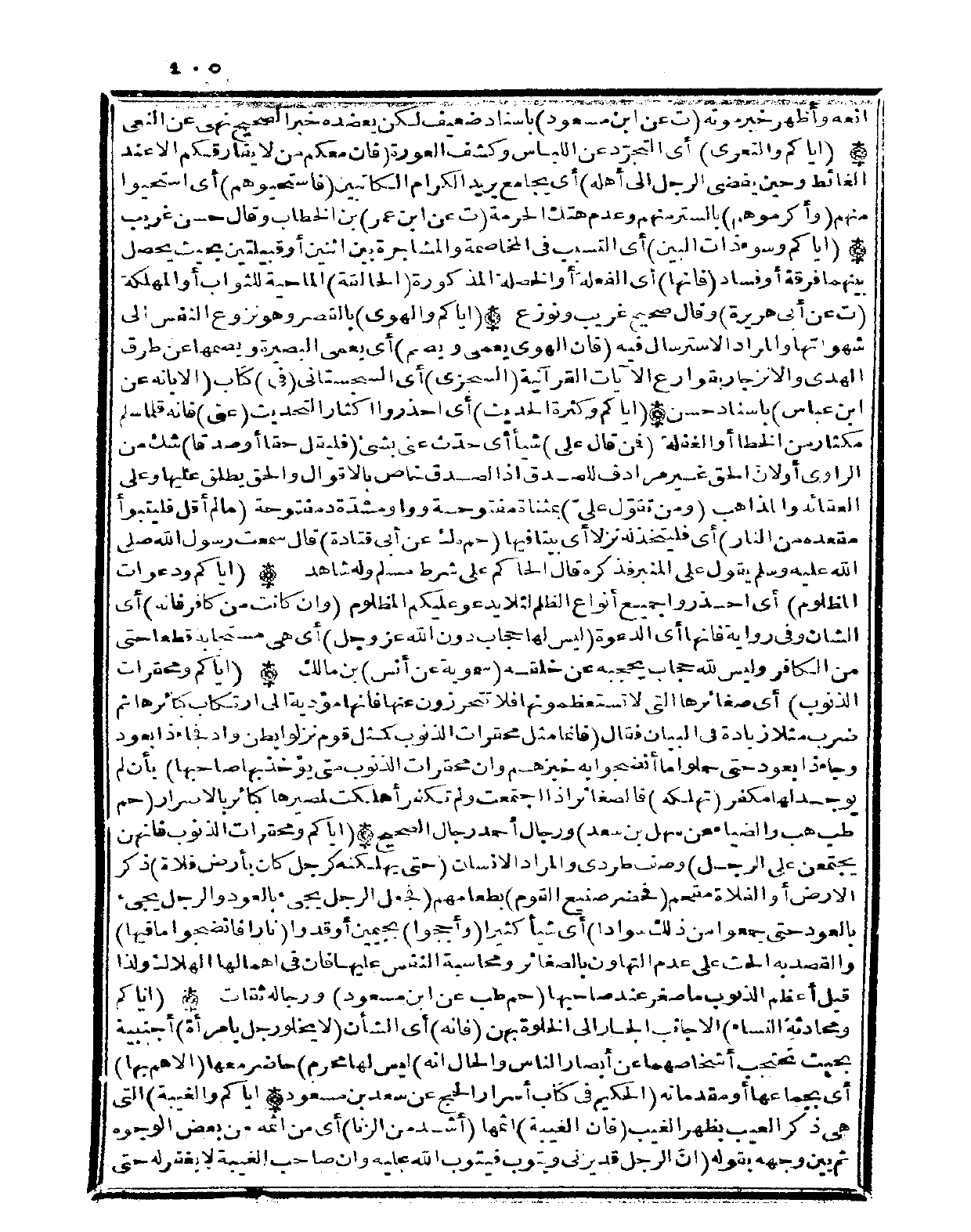 (إيَّاكُمْ ومحقرات الذُّنُوب فَإِنَّهُنَّ يجتمعن على الرجل) وصف طردي وَالْمرَاد الْإِنْسَان (حَتَّى يهلكنه كَرجل كَانَ بِأَرْض فلاة) ذكر الأَرْض أَو الفلاة مقحم (فَحَضَرَ صَنِيع الْقَوْم) بطعامهم (فَجعل الرجل يَجِيء بِالْعودِ وَالرجل يَجِيء بِالْعودِ حَتَّى جمعُوا من ذَلِك سواداً) أَي شَيْئا كثيرا (وأججوا) بجيمين أوقدوا (نَارا فأنضجوا مَا فِيهَا) وَالْقَصْد بِهِ الْحَث على عدم التهاون بالصغائر ومحاسبة النَّفس عَلَيْهَا فَإِن فِي إهمالها الْهَلَاك وَلذَا قيل أعظم الذُّنُوب مَا صغر عِنْد صَاحبهَا (حم طب عَن ابْن مَسْعُود) وَرِجَاله ثِقَات