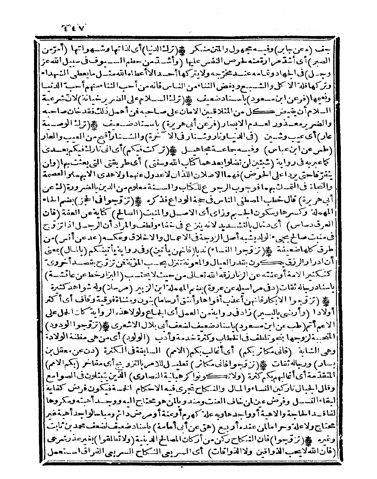 (تزوجوا فَإِنِّي مُكَاثِر) تَعْلِيل لِلْأَمْرِ بِالتَّزْوِيجِ أَي مفاخر (بكم الْأُمَم) الْمُتَقَدّمَة أَي أغالبهم بكم كَثْرَة (وَلَا تَكُونُوا كرهبانية النَّصَارَى) الَّذين يتبتلون فِي الصوامع وقلل الْجبَال تاركين النِّسَاء وَالْمَال وَالنِّكَاح تجْرِي فِيهِ الْأَحْكَام الْخَمْسَة فَيكون فرض كِفَايَة لبَقَاء النَّسْل وَفرض عين لمن خَافَ الْعَنَت ومندوبا لمن هُوَ مُحْتَاج إِلَيْهِ وَوجد أهبته ومكروها لفاقد الْحَاجة والأهبة أووا جد هاوية عِلّة كهرم أَو عَنهُ أَو مرض دَائِم ومباحا لواجد أهبة غير مُحْتَاج وَلَا عِلّة وحراما لمن عِنْده أَربع (هق عَن أبي أُمَامَة) // (بِإِسْنَاد ضَعِيف لضعف مُحَمَّد بن ثَابت وَغَيره) //