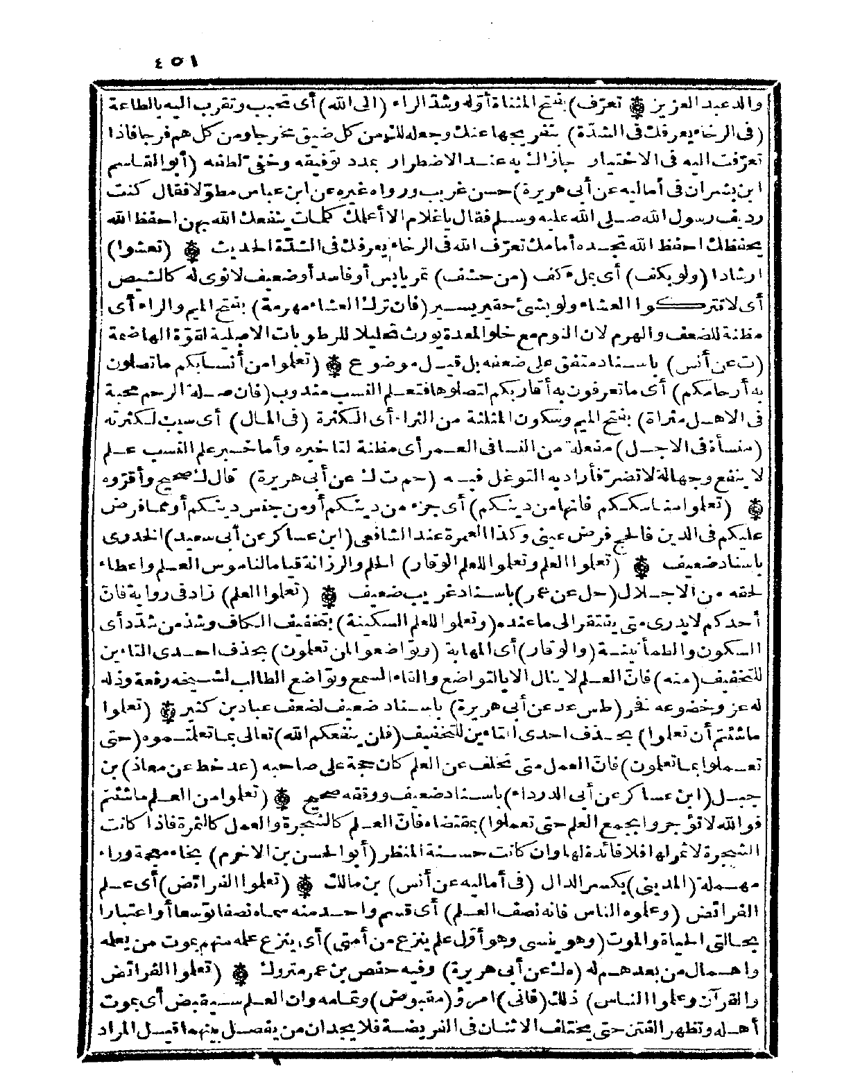 (تعلمُوا من الْعلم مَا شِئْتُم فوَاللَّه لَا تؤجروا بِجمع الْعلم حَتَّى تعملوا) بِمُقْتَضَاهُ فَإِن الْعلم كالشجرة وَالْعَمَل كالثمرة فَإِذا كَانَت الشَّجَرَة لَا ثَمَر لَهَا فَلَا فَائِدَة لَهَا وَإِن كَانَت حَسَنَة المنظر (أَبُو الْحسن بن الأخرم) بخاء مُعْجمَة وَرَاء مُهْملَة (الْمَدِينِيّ) بِكَسْر الدَّال (فِي أَمَالِيهِ عَن أنس) بن مَالك
