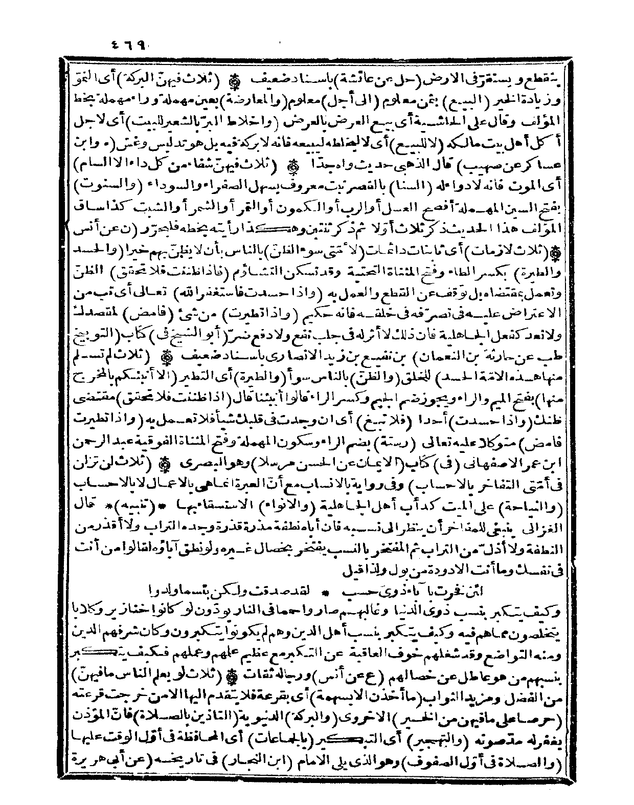 (ثَلَاث لن تزلن فِي أمتِي التفاخر بالاحساب) وَفِي رِوَايَة بالأنساب مَعَ أَن الْعبْرَة إِنَّمَا هِيَ بِالْأَعْمَالِ لَا بالاحساب (والنياحة) على الْمَيِّت كدأب أهل الْجَاهِلِيَّة (والانواء) الاسْتِسْقَاء بهَا (تَنْبِيه) قَالَ الْغَزالِيّ يَنْبَغِي للمفاخر أَن ينظر إِلَى نسبه فَإِن أَبَاهُ نُطْفَة مذرة قذرة وجده التُّرَاب وَلَا أقذر من النُّطْفَة وَلَا أذلّ من التُّرَاب ثمَّ المفتخر بِالنّسَبِ يفتخر بخصال غَيره وَلَو نطق آباؤه لقالوا من أَنْت فِي نَفسك وَمَا أَنْت إِلَّا دودة من بَوْل وَلذَا قيل ( ... لَئِن فخرت بآباء ذَوي حسب ... لقد صدقت وَلَكِن بئْسَمَا ولدُوا)