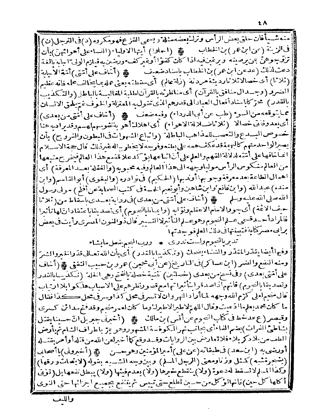(أَخَاف على أمّتي من بعدِي) فِي رِوَايَة بعدِي بِإِسْقَاط من (ثَلَاثًا حيف الْأَئِمَّة) أَي جور الإِمَام الْأَعْظَم ونوّابه (وإيمانا بالنجوم) أَي تَصْدِيقًا باعتقاد أنّ لَهَا تَأْثِيرا فَالْمُرَاد أحد قسمي علم النُّجُوم وَهُوَ علم التَّأْثِير لَا التسيير قَالَ ذُو النُّون الْمصْرِيّ رَأَيْت فِي بعض برابي مصر كِتَابَة فتبينتها فِي ذَلِك الْعلم فَوَجَدتهَا
