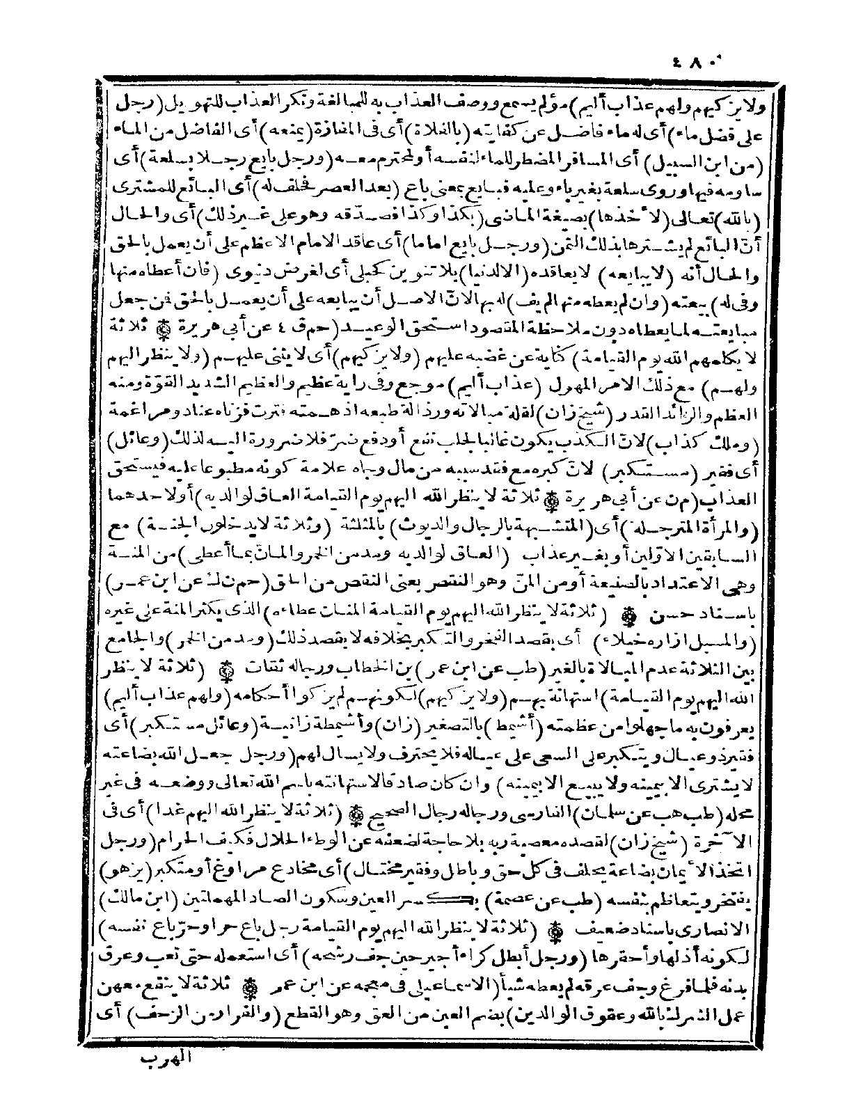 وَلَا يزكيهم وَلَهُم عَذَاب أَلِيم) مؤلم يسمع وَوصف الْعَذَاب بِهِ للْمُبَالَغَة ونكر الْعَذَاب للتهويل (رجل على فضل مَاء) أَي لَهُ مَاء فَاضل عَن كِفَايَته (بالفلاة) أَي فِي الْمَفَازَة (يمنعهُ) أَي الْفَاضِل من المَاء (من ابْن السَّبِيل) أَي الْمُسَافِر الْمُضْطَر للْمَاء لنَفسِهِ أَو لمحترم مَعَه (وَرجل بَايع رجلا بسلعة) أَي ساومه فِيهَا وروى سلْعَة بِغَيْر بَاء وَعَلِيهِ فَبَايع بِمَعْنى بَاعَ (بعد الْعَصْر فَحلف لَهُ) أَي البَائِع للْمُشْتَرِي (بِاللَّه) تَعَالَى (لأخذها) بِصِيغَة الْمَاضِي (بِكَذَا وَكَذَا فَصدقهُ وَهُوَ على غير ذَلِك) أَي وَالْحَال أَن البَائِع لم يشترها بذلك الثّمن (وَرجل بَايع إِمَامًا) أَي عَاقد الإِمَام الْأَعْظَم على أَن يعْمل بِالْحَقِّ وَالْحَال أَنه (لَا يبايعه) لَا يعاقده (إِلَّا لدُنْيَا) بِلَا تَنْوِين كحبلى أَي لغَرَض دُنْيَوِيّ (فَإِن أعطَاهُ مِنْهَا وَفِي لَهُ) بيعَته (وان لم يُعْطه مِنْهَا لم فِي) لَهُ بهَا لَان الأَصْل أَن يبايعه على أَن يعْمل بِالْحَقِّ فَمن جعل مبايعته لما يعطاه دون مُلَاحظَة الْمَقْصُود اسْتحق الْوَعيد (حم ق 4 عَن أبي هُرَيْرَة)