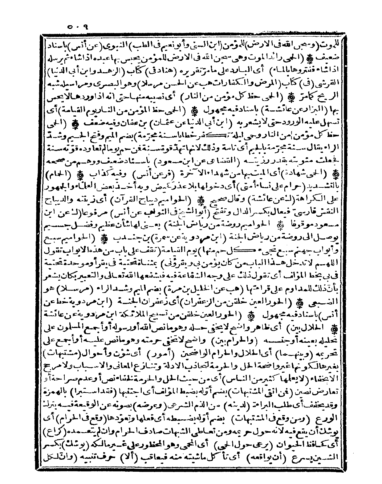 (الْحَلَال بَين) أَي ظَاهر وَاضح لَا يخفى حلّه وَهُوَ مَا نَص الله أَو رَسُوله أَو أجمع الْمُسلمُونَ على تَحْلِيله بِعَيْنِه أَو جنسه (وَالْحرَام بَين) وَاضح لَا تخفى حرمته وَهُوَ مَا نَص عَلَيْهِ أَو أجمع على تَحْرِيمه (وَبَينهمَا) أَي الْحَلَال وَالْحرَام الواضحين (أُمُور) أَي شؤون وأحوال (مُشْتَبهَات) بغَيْرهَا لكَونهَا غير وَاضِحَة الْحل وَالْحُرْمَة لتجاذب الادلة وتنازع الْمعَانِي والاسباب وَلَا مر حج الا بخفاء (لَا يعلمهَا كثير من النَّاس) أَي من حَيْثُ الْحل وَالْحُرْمَة لخفاء نَص أَو عدم صَرَاحَة أَو تعَارض نصين (فَمن اتَّقى المشتبهات) بِضَم أَوله بضبط الْمُؤلف أَي اجتنبها (فقد اسْتَبْرَأَ) بِالْهَمْزَةِ وَقد يُخَفف أَي طلب الْبَرَاءَة (لدينِهِ) من الذَّم الشَّرْعِيّ (وَعرضه) بصونه عَن الوقيعة فِيهِ بترك الْوَرع (وَمن وَقع فِي المشتبهات) بِضَم أَوله يضبطه أى فعلهَا وتعودها (وَقع فِي الْحَرَام) أى يُوشك أَن يَقع فِيهِ لانه حول حريمه وَمن تعاطى الشُّبُهَات صَادف الْحَرَام وان لم يتعمده (كرَاع) أَي كحافظ الْحَيَوَان (يرْعَى حول الْحمى) أَي المحمي وَهُوَ الْمَحْظُور على غير مَالِكه (يُوشك) بِكَسْر الشين يسْرع (أَن يواقعه) أَن تَأْكُل مَاشِيَته مِنْهُ فيعاقب (أَلا) حرف تَنْبِيه (وان لكل