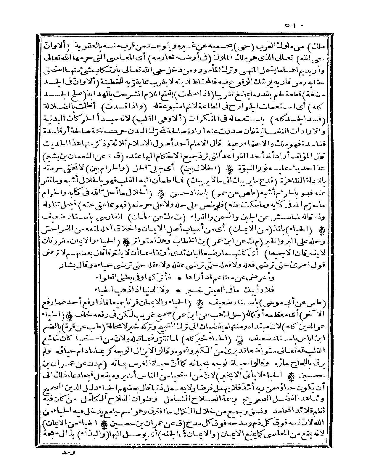 ملك) من مُلُوك الْعَرَب (حمى) يحميه عَن غَيره ويتوعد من قرب مِنْهُ بالعقوبة (أَلا وان حمى الله) تَعَالَى الَّذِي هُوَ ملك الْمُلُوك (فِي أرضه مَحَارمه) أَي الْمعاصِي الَّتِي حرمهَا الله تَعَالَى وَأُرِيد بهَا هُنَا مَا يَشْمَل الْمنْهِي وَترك الْمَأْمُور وَمن دخل حمى الله تَعَالَى بارتكاب شَيْء مِنْهَا اسْتحق عِقَابه وَمن قاربه يُوشك الْوُقُوع فِيهِ فالمحتاط لدينِهِ لَا يقرب مِمَّا يقربهُ للخطيئة (أَلا وَأَن فِي الْجَسَد مُضْغَة) قِطْعَة لحم بِقدر مَا يمضع تَقْرِيبًا (اذا صلحت) بِفَتْح اللَّام انشرحت بالهداية (صلح الْجَسَد كُله) أَي اسْتعْملت الْجَوَارِح فِي الطَّاعَة لانها متبوعة لَهُ (وَإِذا فَسدتْ) أظلمت بالضلالة (فسد الْجَسَد كُله) بِاسْتِعْمَالِهِ فِي الْمُنْكَرَات (الا وَهِي الْقلب) لانه مبدأ الحركات الْبَدَنِيَّة والارادات النفسانية فان صدرت عَنهُ ارادة صَالِحَة تحرّك الْبدن حَرَكَة صَالِحَة أَو فَاسِدَة ففاسدة فَهُوَ ملك والاعضاء رعية قَالَ الامام أَحْمد أصُول الاسلام ثَلَاثَة وَذكر مِنْهَا هَذَا الحَدِيث قَالَ الْمُؤلف أَرَادَ أَنه أحد الْقَوَاعِد الَّتِي ترد جَمِيع الاحكام إِلَيْهَا عِنْده (ق 4 عَن النُّعْمَان بن بشير) هَذَا حَدِيث عَلَيْهِ نور النُّبُوَّة