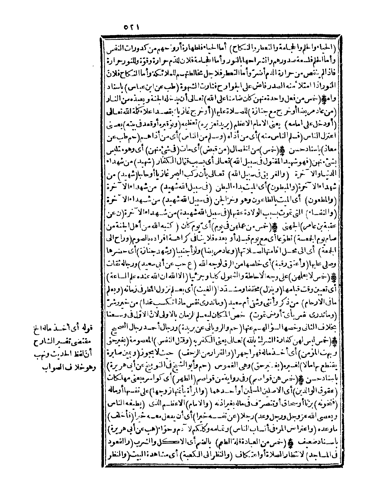 (خمس) من الْخِصَال (من قبض) أَي مَاتَ (فِي شَيْء مِنْهُنَّ) أَي وَهُوَ متلبس بِشَيْء مِنْهُنَّ (فَهُوَ شَهِيد الْمَقْتُول فِي سَبِيل الله) تَعَالَى أَي بِسَبَب قتال الْكفَّار (شَهِيد) من شُهَدَاء الدُّنْيَا وَالْآخِرَة (والغريق فِي سَبِيل الله) تَعَالَى بِأَن ركب الْبَحْر غازيا أَو حَاجا (شَهِيد) من شُهَدَاء الْآخِرَة (والمبطون) أَي الْمَيِّت بداء الْبَطن (فِي سَبِيل الله شَهِيد) من شُهَدَاء الْآخِرَة (والمطعون) أَي الْمَيِّت بالطاعون وَهُوَ وخز الْجِنّ (فِي سَبِيل الله شَهِيد) من شُهَدَاء الْآخِرَة (وَالنُّفَسَاء) الَّتِي تَمُوت بِسَبَب الْولادَة عَقبهَا (فِي سَبِيل الله شهيدة) من شُهَدَاء الْآخِرَة (ن عَن عقبَة بن عَامر) الْجُهَنِيّ
