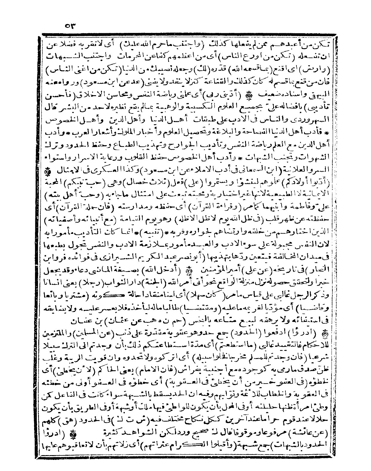 (أدّبوا أَوْلَادكُم) علموهم لينشؤا ويستمروا (على) فعل (ثَلَاث خِصَال) وَهِي (حبّ نَبِيكُم) الْمحبَّة الإيمانية لَا الطبيعية لِأَنَّهَا غير اختيارية ومحبته تبْعَث على امْتِثَال مَا جَاءَ بِهِ (وحبّ أهل بَيته) عليّ وَفَاطِمَة وابنيهما كَمَا مر (وَقِرَاءَة الْقُرْآن) أَي حفظه ومدارسته (فَإِن حَملَة الْقُرْآن) أَي حفظته عَن ظهر قلب (فِي ظلّ الله يَوْم لَا ظلّ إِلَّا ظله) وَهُوَ يَوْم الْقِيَامَة (مَعَ أنبيائه وأصفيائه) الَّذين اخْتَارَهُمْ من خلقه وارتضاهم لجواره وقربه (تَنْبِيه) إِنَّمَا كَانَ التَّأْدِيب مَأْمُورا بِهِ لِأَن النَّفس مجبولة على سوء الْأَدَب وَالْعَبْد مَأْمُور بملازمة الْأَدَب وَالنَّفس تجول بطبعها فِي ميدان الْمُخَالفَة فَيتَعَيَّن ردّها بتهذيبها (أَبُو نصر عبد الْكَرِيم الشِّيرَازِيّ فِي فَوَائده فروا بن النجار) فِي تَارِيخه (عَن عَليّ) أَمِير الْمُؤمنِينَ