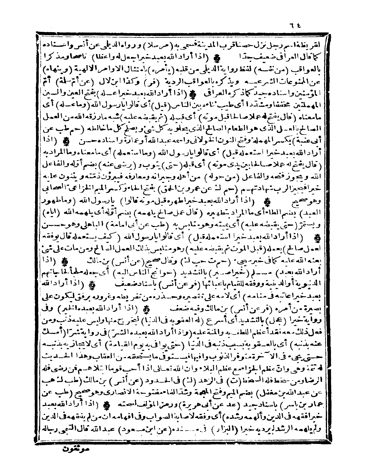 (إِذا أَرَادَ الله بِعَبْدِهِ الْخَيْر) وَفِي رِوَايَة خيرا (عجل) بِالتَّشْدِيدِ أَي أسْرع (لَهُ الْعقُوبَة فِي الدُّنْيَا) ليخرج مِنْهَا وَلَيْسَ عَلَيْهِ ذَنْب وَمن فعل ذَلِك مَعَه فقد أعظم اللطف بِهِ والْمنَّة عَلَيْهِ (وَإِذا أَرَادَ الله بِعَبْدِهِ الشرّ) فِي رِوَايَة شرّا (أمسك عَنهُ بِذَنبِهِ) أَي بالعقوبة بِسَبَب ذَنبه فِي الدُّنْيَا (حَتَّى يوافى بِهِ يَوْم الْقِيَامَة) أَي لَا يجازيه بِذَنبِهِ حَتَّى يَجِيء فِي الْآخِرَة متوفر الذُّنُوب وافيها فيستوفي مَا يسْتَحقّهُ من الْعقَاب وَهَذَا الحَدِيث لَهُ تَتِمَّة وَهِي وإنّ عظم الْجَزَاء من عظم الْبلَاء وَأَن الله تَعَالَى إِذا أحب قوما ابْتَلَاهُم فَمن رَضِي فَلهُ الرِّضَا وَمن سخط فَلهُ السخط (ت) فِي الزّهْد (ك) فِي الْحُدُود (عَن أنس) بن مَالك (طب ك هَب عَن عبد الله بِمَ مُغفل) بِضَم الْمِيم وَفتح الْمُعْجَمَة وشدّ الْفَاء مَفْتُوحَة الْأنْصَارِيّ وَهُوَ صَحِيح (طب عَن عمار بن يَاسر) بِإِسْنَاد جيد (عد عَن أبي هُرَيْرَة) ورمز الْمُؤلف لصِحَّته