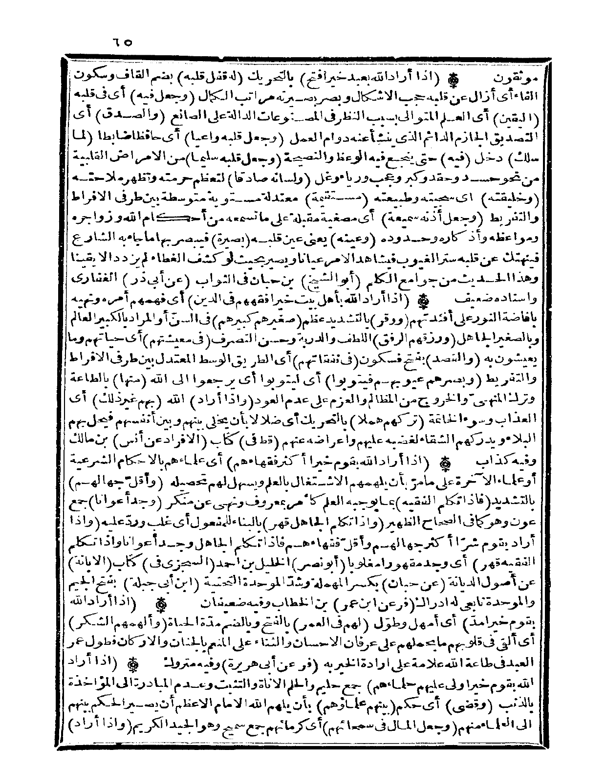 (إِذا أَرَادَ الله بِقوم خيرا أَكثر فقهاءهم) أَي علماءهم بِالْأَحْكَامِ الشَّرْعِيَّة أَو عُلَمَاء الْآخِرَة على مَا مرّ بِأَن يلهمهم الِاشْتِغَال بِالْعلمِ ويسهل لَهُم تَحْصِيله (وأقلّ جهالهم) بِالتَّشْدِيدِ (فَإِذا تكلم الْفَقِيه) بِمَا يُوجِبهُ الْعلم كأمر بِمَعْرُوف وَنهي عَن مُنكر (وجد أعوانا) جمع عون وَهُوَ كَمَا فِي الصِّحَاح الظهير (وَإِذا تكلم الْجَاهِل قهر) بِالْبِنَاءِ للْمَفْعُول أَي غلب وردّ عَلَيْهِ (وَإِذا أَرَادَ بِقوم شرّا أَكثر جهالهم وأقلّ فقهاءهم فَإِذا تكلم الْجَاهِل وجد أعوانا وَإِذا تكلم الْفَقِيه قهر) أَي وجد مقهورا مَغْلُوبًا (أَبُو نصر) الْخَلِيل بن أَحْمد (السجْزِي فِي) كتاب (الْإِبَانَة) عَن أصُول الدّيانَة (عَن حبَان) بِكَسْر الْمُهْملَة وشدّ الْمُوَحدَة التَّحْتِيَّة (ابْن أبي جبلة) بِفَتْح الْجِيم وَالْمُوَحَّدَة تَابِعِيّ لَهُ إِدْرَاك (فر عَن ابْن عمر) بن الْخطاب وَفِيه ضعيفان