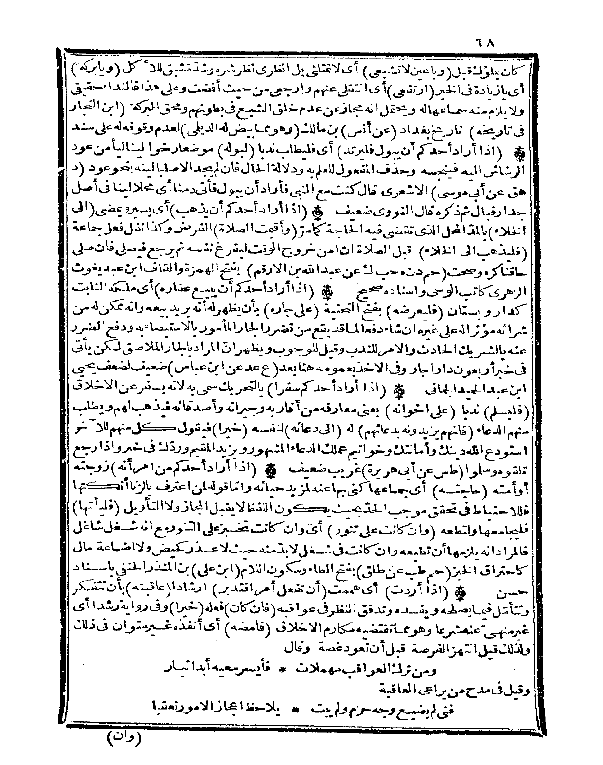 (إِذا أَرَادَ أحدكُم أَن يَبِيع عقاره) أَي ملكه الثَّابِت كدار وبستان (فليعرضه) بِفَتْح التَّحْتِيَّة (على جَاره) بِأَن يظْهر لَهُ أَنه يُرِيد بَيْعه وَأَنه مُمكن لَهُ من شِرَائِهِ مؤثرا لَهُ على غَيره إِن شَاءَ دفعا لما قد يَقع من تضرر الْجَار الْمَأْمُور بالاستيصاء بِهِ وَدفع الضَّرَر عَنهُ بالشريك الْحَادِث وَالْأَمر للنَّدْب وَقيل للْوُجُوب وَيظْهر أَن المُرَاد بالجار الملاصق لَكِن يَأْتِي فِي خبر أَرْبَعُونَ دَارا جَار وَفِي الْأَخْذ بِعُمُومِهِ هُنَا بعد (ع عد عَن ابْن عَبَّاس) ضَعِيف لضعف يحيى ابْن عبد الحميد الْحمانِي