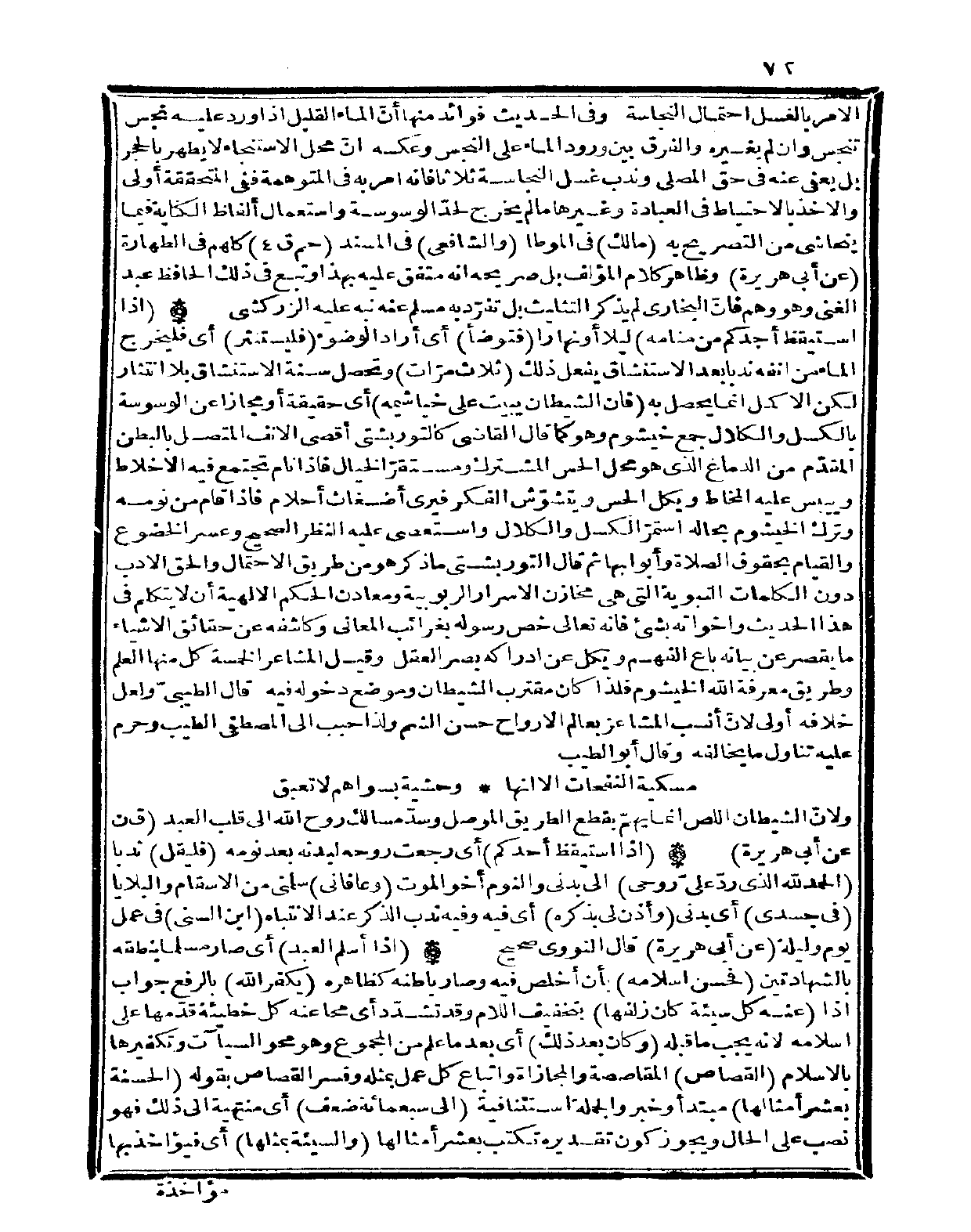 الْأَمر بِالْغسْلِ احْتِمَال النَّجَاسَة وَفِي الحَدِيث فَوَائِد مِنْهَا أنّ المَاء الْقَلِيل إِذا ورد عَلَيْهِ نجس تنجس وَإِن لم يُغَيِّرهُ وَالْفرق بَين وُرُود المَاء على النَّجس وَعَكسه أنّ مَحل الِاسْتِنْجَاء لَا يطهر بِالْحجرِ بل يُعْفَى عَنهُ فِي حق الْمصلى وَندب غسل النَّجَاسَة ثَلَاثًا فَإِنَّهُ أَمر بِهِ فِي المتوهمة فَفِي المتحققة أولى وَالْأَخْذ بِالِاحْتِيَاطِ فِي الْعِبَادَة وَغَيرهَا مَا لم يخرج لحدّ الوسوسة وَاسْتِعْمَال أَلْفَاظ الْكِنَايَة فِيمَا يتحاشى من التَّصْرِيح بِهِ (مَالك) فِي الْمُوَطَّأ (وَالشَّافِعِيّ) فِي الْمسند (حم ق 4) كلهم فِي الطَّهَارَة (عَن أبي هُرَيْرَة) وَظَاهر كَلَام الْمُؤلف بل صَرِيحه أَنه مُتَّفق عَلَيْهِ بِهَذَا وَتبع فِي ذَلِك الْحَافِظ عبد الْغَنِيّ وَهُوَ وهم فإنّ البُخَارِيّ لم يذكر التَّثْلِيث بل تفرّد بِهِ مُسلم عَنهُ نبه عَلَيْهِ الزَّرْكَشِيّ
