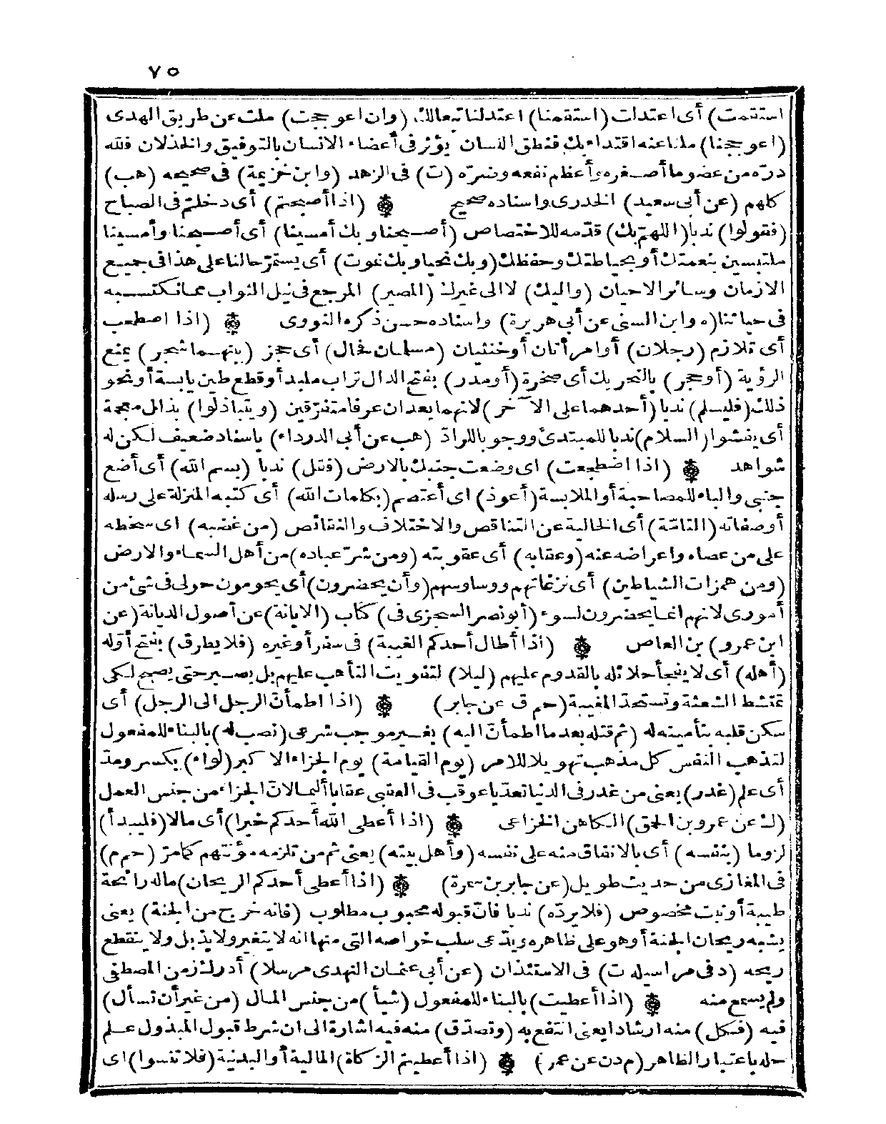 (إِذا اضطجعت) أَي وضعت جَنْبك بِالْأَرْضِ (فَقل) ندبا (بِسم الله) أَي أَضَع جَنْبي وَالْبَاء للمصاحبة أَو الملابسة (أعوذ) أَي أَعْتَصِم (بِكَلِمَات الله) أَي كتبه الْمنزلَة على رسله أَو صِفَاته (التامّة) أَي الخالية عَن التناقص وَالِاخْتِلَاف والنقائص (من غَضَبه) أَي سخطه على من عَصَاهُ وإعراضه عَنهُ (وعقابه) أَي عُقُوبَته (وَمن شرّ عباده) من أهل السَّمَاء وَالْأَرْض (وَمن همزات الشَّيَاطِين) أَي نزعاتهم ووساوسهم (وَأَن يحْضرُون) أَي يحومون حَولي فِي شَيْء من أموري لأَنهم إِنَّمَا يحْضرُون لسوء (أَبُو نصر السجْزِي فِي) كتاب (الْإِبَانَة) عَن أصُول الدّيانَة (عَن ابْن عَمْرو) بن الْعَاصِ