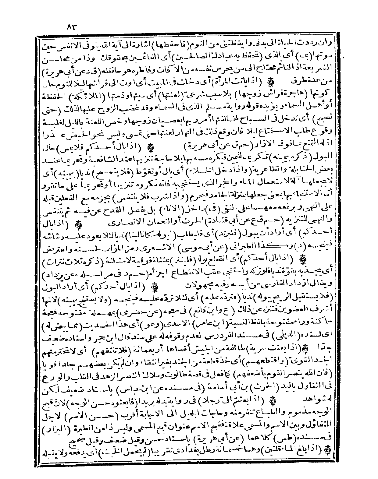 (إِذا باتت الْمَرْأَة) أَي دخلت فِي الْمبيت أَي أوت إِلَى فراشها لَيْلًا للنوم حَال كَونهَا (هاجرة فرَاش زَوجهَا) بِلَا سَبَب شرعيّ (لعنتها) أَي سبتها وذمتها (الْمَلَائِكَة) الْحفظَة أَو أهل السَّمَاء وَيُؤَيِّدهُ قَوْله رِوَايَة مُسلم الَّذِي فِي السَّمَاء وَقد غضب الزَّوْج عَلَيْهَا لذَلِك (حَتَّى تصبح) أَي تدخل فِي الصَّباح لمخالفتها أَمر رَبهَا بعصيان زَوجهَا وَخص اللَّعْنَة بِاللَّيْلِ لغَلَبَة وُقُوع طلب الِاسْتِمْتَاع لَيْلًا فَإِن وَقع ذَلِك فِي النَّهَار لعنتها حَتَّى تمسي وَلَيْسَ نَحْو الْحيض عذرا إِذْ لَهُ التَّمَتُّع بِمَا فَوق الْإِزَار (حم ق عَن أبي هُرَيْرَة)