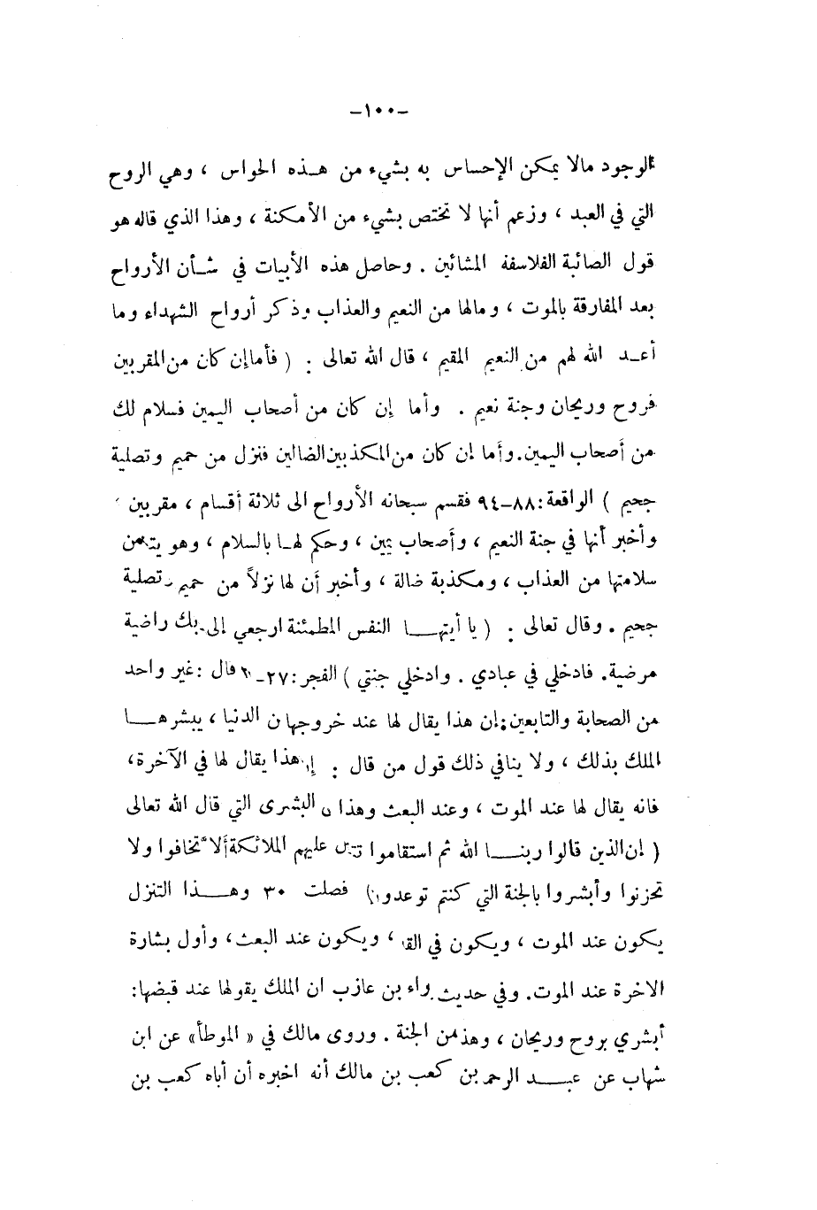 الْوُجُود مَا لَا يُمكن الاحساس بِهِ بِشَيْء من هَذِه الْحَواس وَهِي الرّوح الَّتِي فِي العَبْد وَزعم أَنَّهَا لَا تخْتَص بِشَيْء من الامكنة وَهَذَا الَّذِي قَالَه هُوَ قَول الصائبة الفلاسفة الْمَشَّائِينَ وَحَاصِل هَذِه الابيات فِي شَأْن الارواح بعد الْمُفَارقَة بِالْمَوْتِ وَمَا لَهَا من النَّعيم وَالْعَذَاب وذ كرّ أَرْوَاح الشُّهَدَاء وَمَا أعد الله لَهُم من النَّعيم الْمُقِيم قَالَ الله تَعَالَى {فَأَما إِن كَانَ من المقربين فَروح وَرَيْحَان وجنة نعيم وَأما إِن كَانَ من أَصْحَاب الْيَمين فسلام لَك من أَصْحَاب الْيَمين وَأما إِن كَانَ من المكذبين الضَّالّين فَنزل من حميم وتصلية جحيم} الْوَاقِعَة 88 94 فقسم سُبْحَانَهُ الارواح الى ثَلَاثَة أَقسَام مقربين وَأخْبر أَنَّهَا فِي جنَّة النَّعيم وَأَصْحَاب يَمِين وَحكم لَهَا بِالسَّلَامِ وَهُوَ يتَضَمَّن سلامتها من الْعَذَاب ومكذبة ضَالَّة وَأخْبر أَن لَهَا نزلا من حميم وتصلية جحيم وَقَالَ تَعَالَى {يَا أيتها النَّفس المطمئنة ارجعي إِلَى رَبك راضية مرضية فادخلي فِي عبَادي وادخلي جنتي} الْفجْر 27 29 قَالَ غير وَاحِد من الصَّحَابَة وَالتَّابِعِينَ ان هَذَا يُقَال لَهَا عِنْد خُرُوجهَا من الدُّنْيَا يبشرها الْملك بذلك وَلَا يُنَافِي ذَلِك قَول من قَالَ ان هَذَا يُقَال لَهَا فِي الْآخِرَة فانه يُقَال لَهَا عِنْد الْمَوْت وَعند الْبَعْث وَهَذَا من الْبُشْرَى الَّتِي قَالَ الله تَعَالَى {إِن الَّذين قَالُوا رَبنَا الله ثمَّ استقاموا تتنزل عَلَيْهِم الْمَلَائِكَة أَلا تخافوا وَلَا تحزنوا وَأَبْشِرُوا بِالْجنَّةِ الَّتِي كُنْتُم توعدون} فصلت 30 وَهَذَا التنزل يكون عِنْد الْمَوْت وَيكون فِي الْقَبْر وَيكون عِنْد الْبَعْث وَأول بِشَارَة الاخرة عِنْد الْمَوْت وَفِي حَدِيث الْبَراء بن عَازِب ان الْملك يَقُولهَا عِنْد قبضهَا ابشري بِروح وَرَيْحَان وَهَذَا من الْجنَّة وروى مَالك فِي (الْمُوَطَّأ (عَن ابْن شهَاب عَن عبد الرَّحْمَن بن كَعْب بن مَالك أَنه اخبره أَن اباه كَعْب بن