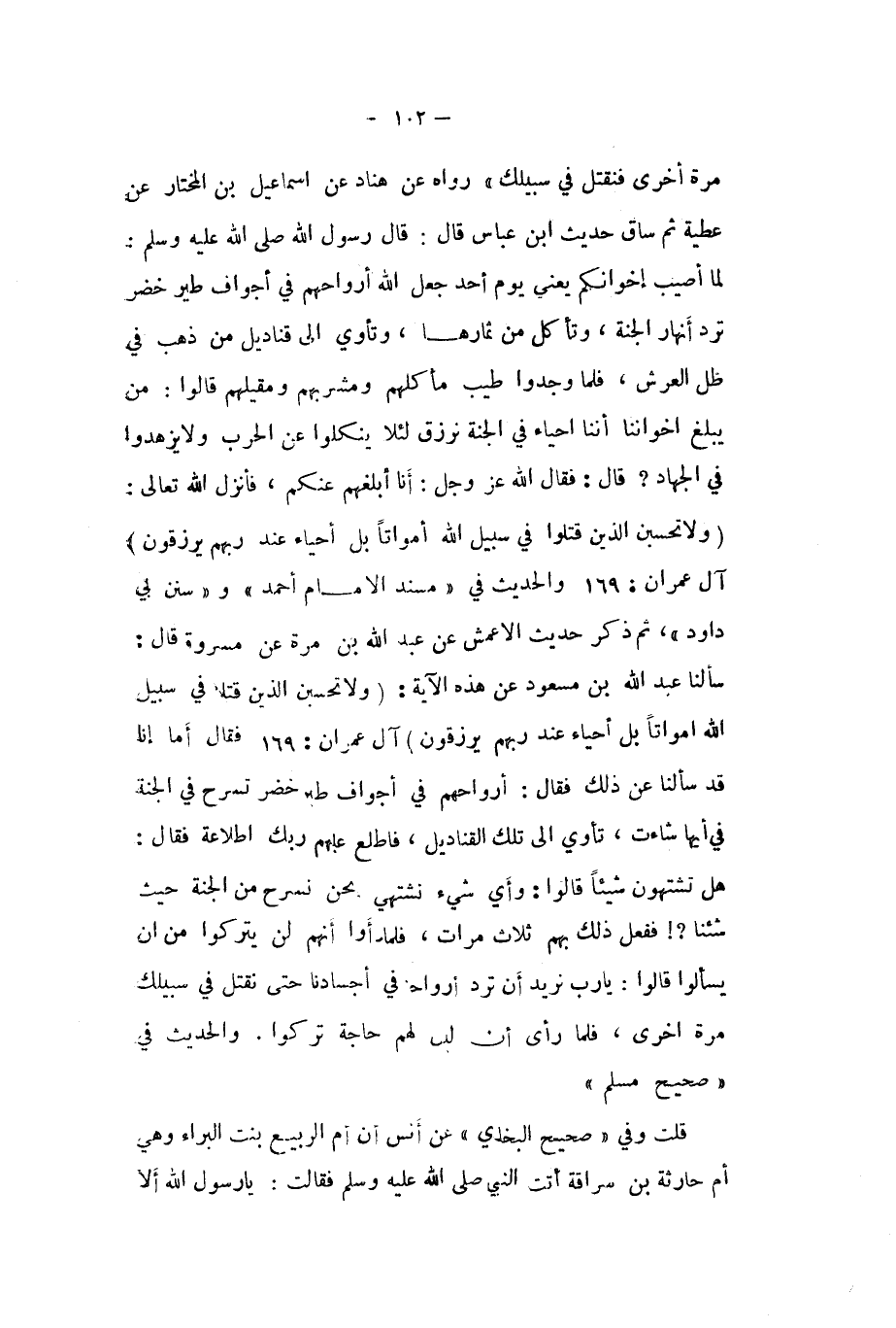 مرّة أُخْرَى فنقتل فِي سَبِيلك (رَوَاهُ عَن هناد عَن اسماعيل بن الْمُخْتَار عَن عَطِيَّة ثمَّ سَاق حَدِيث ابْن عَبَّاس قَالَ قَالَ رَسُول الله صلى الله عَلَيْهِ وَسلم لما أُصِيب اخوانكم يَعْنِي يَوْم أحد جعل الله أَرْوَاحهم فِي أَجْوَاف طير خضر ترد أَنهَار الْجنَّة وتأكل من ثمارها وتأوي الى قناديل من ذهب فِي ظلّ الْعَرْش فَلَمَّا وجدوا طيب مَأْكَلهمْ وَمَشْرَبهمْ وَمَقِيلهمْ قَالُوا من يبلغ اخواننا أننا احياء فِي الْجنَّة نرْزق لِئَلَّا ينكلُوا عَن الْحَرْب وَلَا يَزْهَدُوا فِي الْجِهَاد قَالَ فَقَالَ الله عز وَجل أَنا أبلغهم عَنْكُم فَأنْزل الله تَعَالَى {وَلَا تحسبن الَّذين قتلوا فِي سَبِيل الله أَمْوَاتًا بل أَحيَاء عِنْد رَبهم يرْزقُونَ} آل عمرَان 169 والْحَدِيث فِي (مُسْند الامام أَحْمد (و (سنَن ابي دَاوُد (ثمَّ ذكر حَدِيث الاعمش عَن عبد الله بن مرّة عَن مَسْرُوق قَالَ سَأَلنَا عبد الله بن مَسْعُود عَن هَذِه الاية {وَلَا تحسبن الَّذين قتلوا فِي سَبِيل الله أَمْوَاتًا بل أَحيَاء عِنْد رَبهم يرْزقُونَ} آل عمرَان 169 فَقَالَ أما إِنَّا قد سَأَلنَا عَن ذَلِك فَقَالَ أَرْوَاحهم فِي أَجْوَاف طير خضر تسرح فِي الْجنَّة فِي أَيهَا شَاءَت تأوي الى تِلْكَ الْقَنَادِيل فَاطلع عَلَيْهِم رَبك اطلاعة فَقَالَ هَل تشتهون شَيْئا قَالُوا وَأي شَيْء نشتهي وَنحن نَسْرَح من الْجنَّة حَيْثُ شِئْنَا فَفعل ذَلِك بهم ثَلَاث مَرَّات فَلَمَّا رَأَوْا أَنهم لن يتْركُوا من ان يسْأَلُوا قَالُوا يَا رب نُرِيد أَن ترد أَرْوَاحنَا فِي أَجْسَادنَا حَتَّى نقْتل فِي سَبِيلك مرّة اخرى فَلَمَّا رأى أَن لَيْسَ لَهُم حَاجَة تركُوا والْحَدِيث فِي (صَحِيح مُسلم (