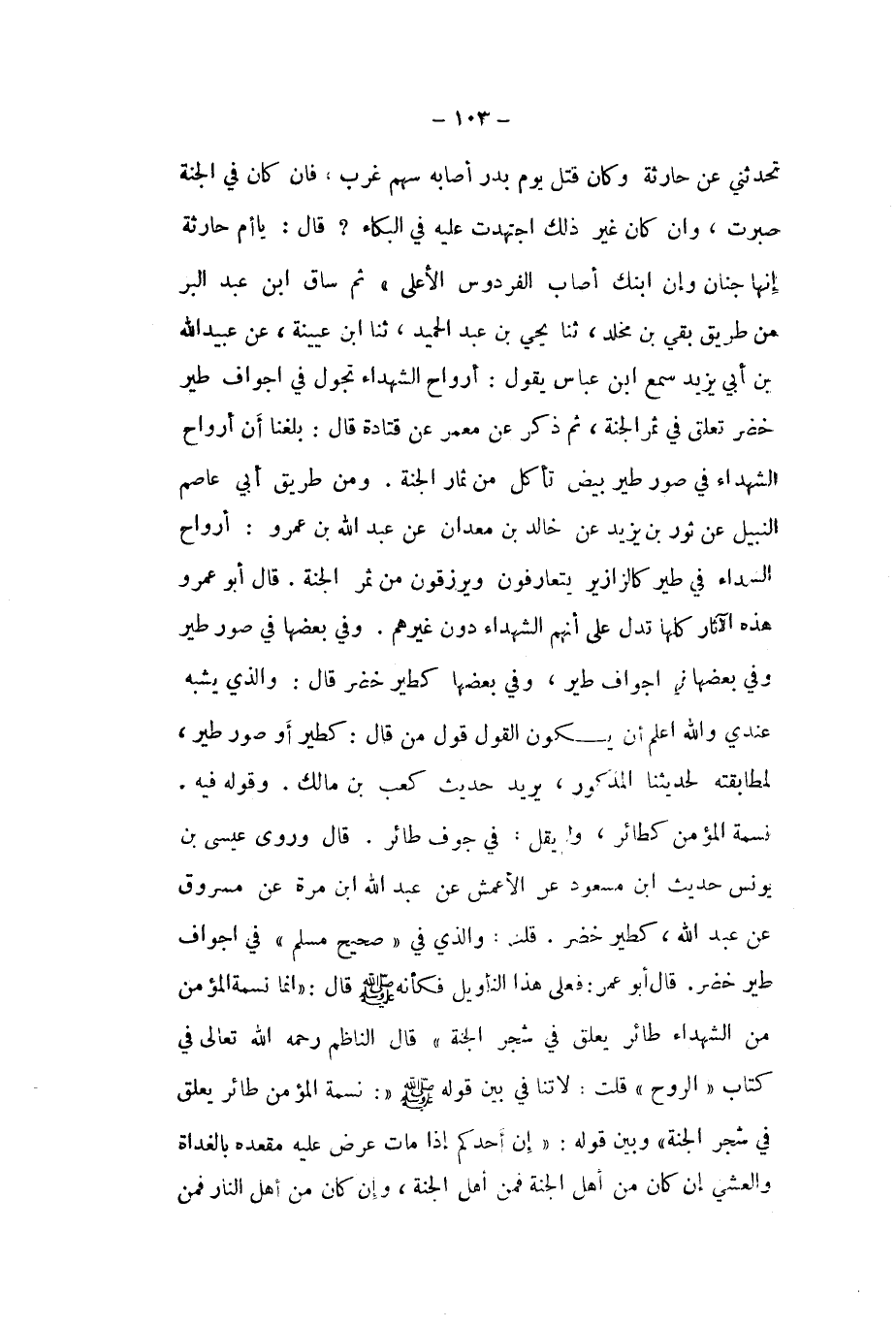 تُحَدِّثنِي عَن حَارِثَة وَكَانَ قتل يَوْم بدر أَصَابَهُ سهم غرب فان كَانَ فِي الْجنَّة صبرت وان كَانَ غير ذَلِك اجتهدت عَلَيْهِ فِي الْبكاء قَالَ يَا أم حَارِثَة إِنَّهَا جنان وَإِن ابْنك أصَاب الفردوس الاعلى ثمَّ سَاق ابْن عبد الْبر من طَرِيق بَقِي بن مخلد ثَنَا يحيى بن علدالحميد ثَنَا ابْن عُيَيْنَة عَن عبيد الله بن أبي يزِيد سمع ابْن عَبَّاس يَقُول أَرْوَاح الشُّهَدَاء تجول فِي اجواف طير خضر تعلق فِي ثَمَر الْجنَّة ثمَّ ذكر عَن معمر عَن قَتَادَة قَالَ بلغنَا أَن أَرْوَاح الشُّهَدَاء فِي صور طير بيض تَأْكُل من ثمار الْجنَّة وَمن طَرِيق أبي عَاصِم النَّبِيل عَن ثَوْر بن يزِيد عَن خَالِد بن معدان عَن عبد الله بن عَمْرو أَرْوَاح الشُّهَدَاء فِي طير كالزازير يَتَعَارَفُونَ وَيُرْزَقُونَ من ثَمَر الْجنَّة قَالَ أَبُو عَمْرو هَذِه الْآثَار كلهَا تدل على أَنهم الشُّهَدَاء دون غَيرهم وَفِي بَعْضهَا فِي صور طير وَفِي بَعْضهَا فِي اجواف طير وَفِي بَعْضهَا كطير خضر قَالَ وَالَّذِي يشبه عِنْدِي وَالله أعلم أَن يكون القَوْل قَول من قَالَ كطير أَو صور طير لمطابقته لحديثنا الْمَذْكُور يُرِيد حَدِيث كَعْب بن مَالك وَقَوله فِيهِ نسمَة الْمُؤمن كطائر وَلم يقل فِي جَوف طَائِر قَالَ وروى عِيسَى بن يُونُس حَدِيث ابْن مَسْعُود عَن الاعمش عَن عبد الله ابْن مرّة عَن مَسْرُوق عَن عبد الله كطير خضر قلت وَالَّذِي فِي (صَحِيح مُسلم (فِي اجواف طير خضر قَالَ أَبُو عمر فعلى هَذَا التَّأْوِيل فَكَأَنَّهُ صلى الله عَلَيْهِ وَسلم قَالَ (انما نسمَة الْمُؤمن من الشُّهَدَاء طَائِر يعلق فِي شجر الْجنَّة (قَالَ النَّاظِم رَحمَه الله تَعَالَى فِي كتاب (الرّوح (قلت لاتنا فِي بَين قَوْله صلى الله عَلَيْهِ وَسلم (نسمَة الْمُؤمن طَائِر يعلق فِي شجر الْجنَّة (وَبَين قَوْله (إِن أحدكُم إِذا مَاتَ عرض عَلَيْهِ مَقْعَده بِالْغَدَاةِ والعشي إِن كَانَ من اهل الْجنَّة فَمن أهل الْجنَّة وَإِن كَانَ من أهل النَّار فَمن
