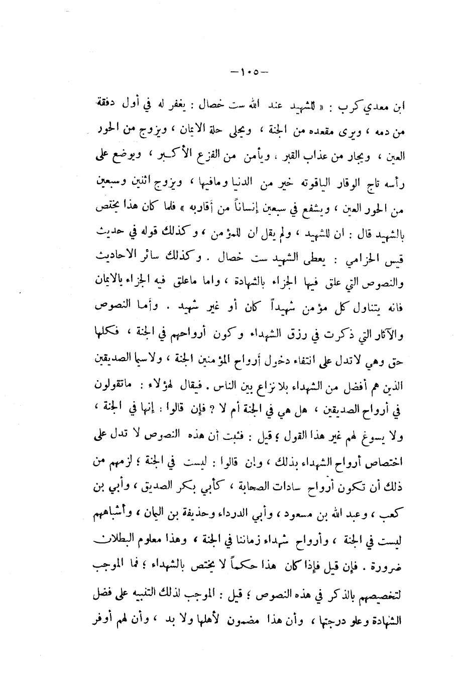 ابْن معدي كرب (للشهيد عِنْد الله سِتّ خِصَال يغْفر لَهُ فِي أول دفقة من دَمه وَيرى مَقْعَده من الْجنَّة ويحلى حلَّة الايمان ويزوج من الْحور الْعين ويجار من عَذَاب الْقَبْر ويأمن من الْفَزع الاكبر وَيُوضَع على رَأسه تَاج الْوَقار الياقوته خير من الدُّنْيَا وَمَا فِيهَا ويزوج اثْنَيْنِ وَسبعين من الْحور الْعين ويشفع فِي سبعين انسانا من أَقَاربه (فَلَمَّا كَانَ هَذَا يخْتَص بالشهيد قَالَ ان للشهيد وَلم يقل ان لِلْمُؤمنِ وَكَذَلِكَ قَوْله فِي حَدِيث قيس الْحزَامِي يعْطى الشَّهِيد سِتّ خِصَال وَكَذَلِكَ سَائِر الاحاديث والنصوص الَّتِي علق فِيهَا الْجَزَاء بِالشَّهَادَةِ واما مَا علق فِيهِ الْجَزَاء بالايمان فانه يتَنَاوَل كل مُؤمن شَهِيدا كَانَ اَوْ غير شَهِيد وَأما النُّصُوص والْآثَار الَّتِي ذكرت فِي رزق الشُّهَدَاء وَكَون أَرْوَاحهم فِي الْجنَّة فَكلهَا حق وَهِي لَا تدل على انْتِفَاء دُخُول أَرْوَاح الْمُؤمنِينَ الْجنَّة وَلَا سِيمَا الصديقين الَّذين هم أفضل من الشُّهَدَاء بِلَا نزاع بَين النَّاس فَيُقَال لهَؤُلَاء مَا تَقولُونَ فِي أَرْوَاح الصديقين هَل هِيَ فِي الْجنَّة أم لَا فَإِن قَالُوا إِنَّهَا فِي الْجنَّة وَلَا يسوغ لَهُم غير هَذَا القَوْل قيل فَثَبت أَن هَذِه النُّصُوص لَا تدل على اخْتِصَاص أَرْوَاح الشُّهَدَاء بذلك وَإِن قَالُوا لَيست فِي الْجنَّة لَزِمَهُم من ذَلِك أَن تكون أَرْوَاح سَادَات الصَّحَابَة كَأبي بكر الصّديق وَأبي بن كَعْب وعبد الله بن مَسْعُود وَأبي الدَّرْدَاء وَحُذَيْفَة بن الْيَمَان وأشباههم لَيست فِي الْجنَّة وأرواح شُهَدَاء زَمَاننَا فِي الْجنَّة وَهَذَا مَعْلُوم الْبطلَان ضَرُورَة فَإِن قيل فَإِذا كَانَ هَذَا حكما لَا يخْتَص بِالشُّهَدَاءِ فَمَا الْمُوجب لتخصيصهم بِالذكر فِي هَذِه النُّصُوص قيل الْمُوجب لذَلِك التَّنْبِيه على فضل الشَّهَادَة وعلو درجتها وان هَذَا مَضْمُون لاهلها ولابد وَأَن لَهُم أوفر