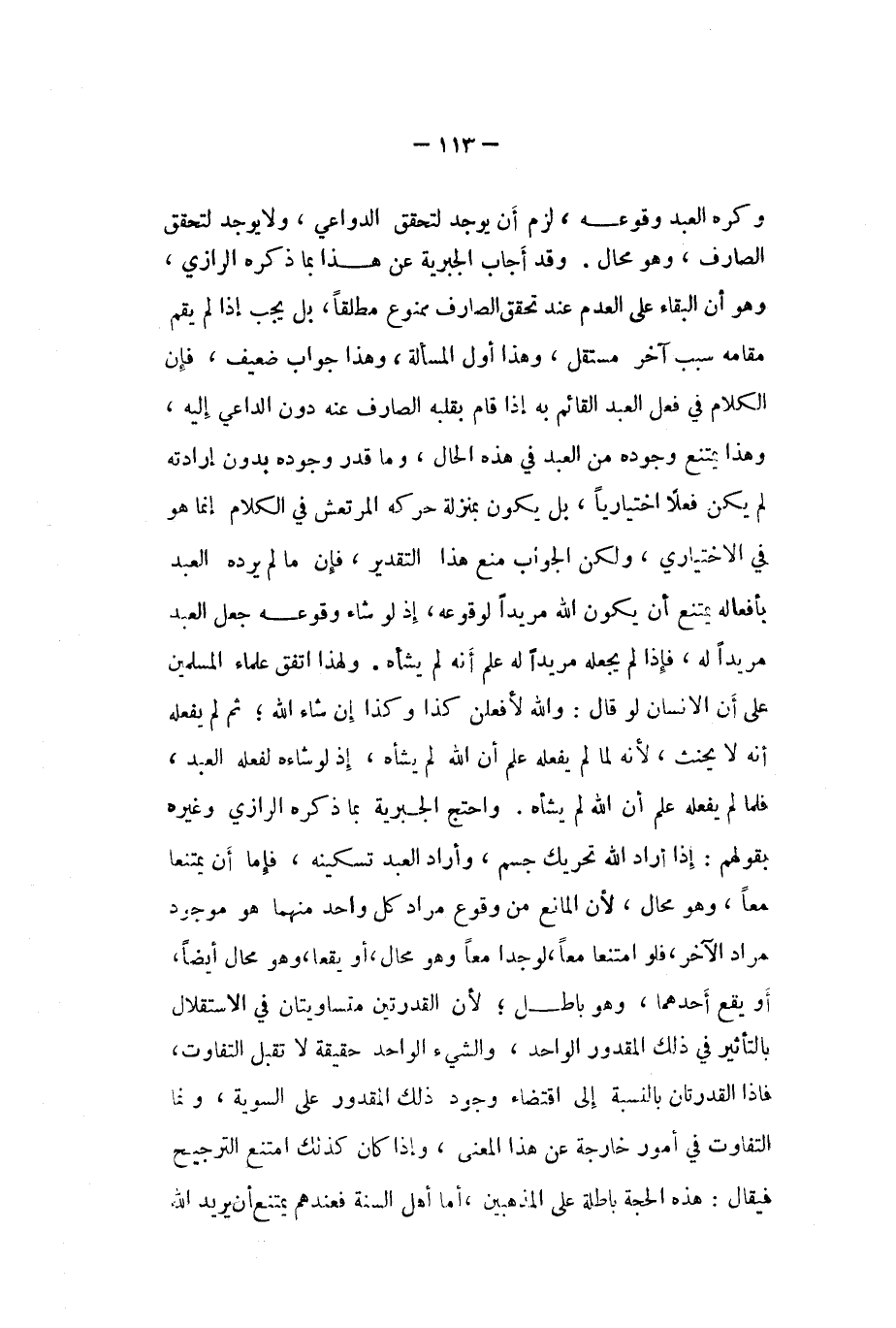 وَكره العَبْد وُقُوعه لزم أَن يُوجد لتحَقّق الدَّوَاعِي وَلَا يُوجد لتحَقّق الصَّارِف وَهُوَ محَال وَقد أجَاب الجبرية عَن هَذَا بِمَا ذكره الرَّازِيّ وَهُوَ أَن الْبَقَاء على الْعَدَم عِنْد تحقق الصَّارِف مَمْنُوع مُطلقًا بل يجب إِذا لم يقم مقَامه سَبَب آخر مُسْتَقل وَهَذَا أول الْمَسْأَلَة وَهَذَا جَوَاب ضَعِيف فَإِن الْكَلَام فِي فعل العَبْد الْقَائِم بِهِ إِذا قَامَ بِقَلْبِه الصَّارِف عَنهُ دون الدَّاعِي إِلَيْهِ وَهَذَا يمْتَنع وجوده من العَبْد فِي هَذِه الْحَال وَمَا قدر وجوده بِدُونِ إِرَادَته لم يكن فعلا اختياريا بل يكون بِمَنْزِلَة حركه المرتعش فِي الْكَلَام إِنَّمَا هُوَ فِي الِاخْتِيَارِيّ وَلَكِن الْجَواب منع هَذَا التَّقْدِير فَإِن مَا لم يردهُ العَبْد بأفعاله يمْتَنع أَن يكون الله مرِيدا لوُقُوعه إِذْ لَو شَاءَ وُقُوعه جعل العَبْد مرِيدا لَهُ فَإِذا لم يَجعله مرِيدا لَهُ علم أَنه لم يشأه وَلِهَذَا اتّفق عُلَمَاء الْمُسلمين على أَن الانسان لَو قَالَ وَالله لافعلن كَذَا وَكَذَا إِن شَاءَ الله ثمَّ لم يَفْعَله أَنه لَا يَحْنَث لانه لما لم يَفْعَله علم أَن الله لم يشأه إِذْ لَو شاءه لفعله العَبْد فَلَمَّا لم يَفْعَله علم أَن الله لم يشأه وَاحْتج الجبرية بِمَا ذكره الرَّازِيّ وَغَيره بقَوْلهمْ إِذا أَرَادَ الله تَحْرِيك جسم وَأَرَادَ العَبْد تسكينه فإمَّا أَن يمتنعا مَعًا وَهُوَ محَال لِأَن الْمَانِع من وُقُوع مُرَاد كل وَاحِد مِنْهُمَا هُوَ مَوْجُود مُرَاد الاخر فَلَو امتنعا مَعًا لوجدا مَعًا وَهُوَ محَال أَو يقعا وَهُوَ محَال أَيْضا اَوْ يَقع أَحدهمَا وَهُوَ بَاطِل لِأَن القدرتين متساويتان فِي الِاسْتِقْلَال بالتأثير فِي ذَلِك الْمَقْدُور الْوَاحِد وَالشَّيْء الْوَاحِد حَقِيقَة لَا تقبل التَّفَاوُت فَإِذا القدرتان بِالنِّسْبَةِ الى اقْتِضَاء وجود ذَلِك الْمَقْدُور على السوية ونما التَّفَاوُت فِي أُمُور خَارِجَة عَن هَذَا الْمَعْنى واذا كَانَ كَذَلِك امْتنع التَّرْجِيح فَيُقَال هَذِه الْحجَّة بَاطِلَة على المذهبين اما أهل السّنة فعندهم يمْتَنع أَن يُرِيد الله