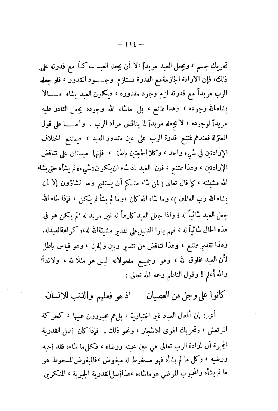 تَحْرِيك جسم وَيجْعَل العَبْد مرِيدا لَا أَن يَجعله العَبْد سَاكِنا مَعَ قدرته على ذَلِك فَإِن الارادة الجازمة مَعَ الْقُدْرَة تَسْتَلْزِم وجود الْمَقْدُور فَلَو جعله الرب مرِيدا مَعَ قدرته لزم وجود مقدوره فَيكون العَبْد يَشَاء مَالا يَشَاء الله وجوده وَهَذَا مُمْتَنع بل مَا شَاءَ الله وجوده يَجْعَل الْقَادِر عَلَيْهِ مرِيدا لوُجُوده لَا يَجعله مرِيدا لما يُنَاقض مُرَاد الرب وَأما على قَول الْمُعْتَزلَة فعندهم تمْتَنع قدرَة الرب على عين مَقْدُور العَبْد فَيمْتَنع اخْتِلَاف الارادتين فِي شَيْء وَاحِد وكلا الحجتين بَاطِلَة فَإِنَّهُمَا مبنيتان على تنَاقض الإرادتين وَهَذَا مُمْتَنع فَإِن العَبْد إِذا شَاءَ ان يكون (شَيْء (لم يشأه حَتَّى يَشَاء الله مَشِيئَته كَمَا قَالَ تَعَالَى {لمن شَاءَ مِنْكُم أَن يَسْتَقِيم وَمَا تشاؤون إِلَّا أَن يَشَاء الله رب الْعَالمين} وَمَا شَاءَ الله كَانَ وَمَا لم يَشَأْ لم يكن فَإِذا شَاءَ الله جعل العَبْد شائيا لَهُ واذا جعل العَبْد كَارِهًا لَهُ غير مُرِيد لَهُ لم يكن هُوَ فِي هَذِه الْحَال شائيا لَهُ فهم بنوا الدَّلِيل على تَقْدِير مَشِيئَة الله لَهُ وَكَرَاهَة العَبْد لَهُ وَهَذَا تَقْدِير مُمْتَنع وَهَذَا تنَاقض من تَقْدِير ربين والهين وَهُوَ قِيَاس بَاطِل لِأَن العَبْد مَخْلُوق لله وَهُوَ وَجَمِيع مفعولاته لَيْسَ هُوَ مثلا لله ولاندا وَالله أعلم وَقَول النَّاظِم رَحمَه الله تَعَالَى