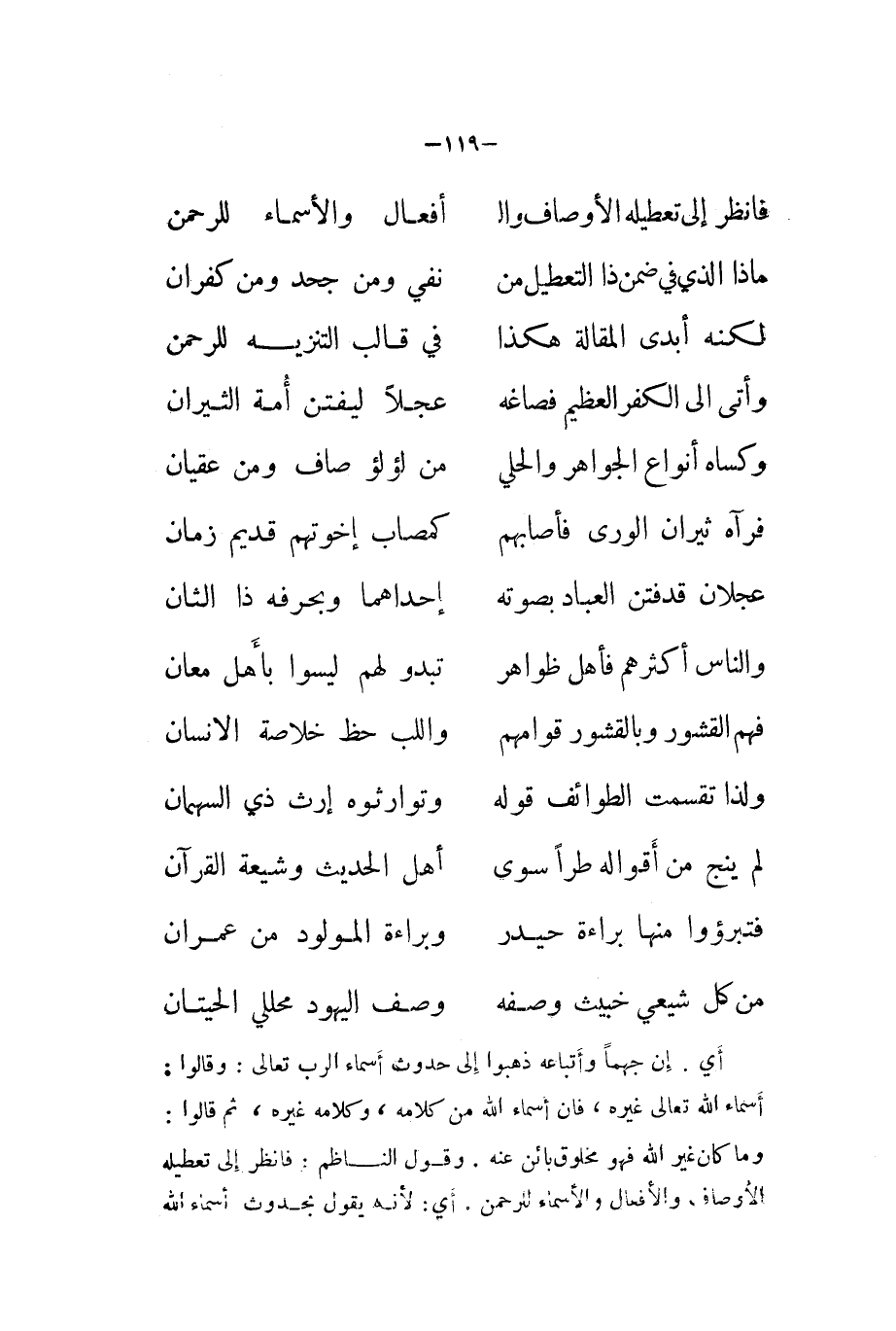 أَي إِن جهما وَأَتْبَاعه ذَهَبُوا الى حُدُوث أَسمَاء الرب تَعَالَى وَقَالُوا أَسمَاء الله تَعَالَى غَيره فَإِن أَسمَاء الله من كَلَامه وَكَلَامه غَيره ثمَّ قَالُوا وَمَا كَانَ غير الله فَهُوَ مَخْلُوق بَائِن عَنهُ وَقَول النَّاظِم فَانْظُر إِلَى تعطيله الاوصاف والافعال والاسماء للرحمن أَي لانه يَقُول بحدوث أَسمَاء الله