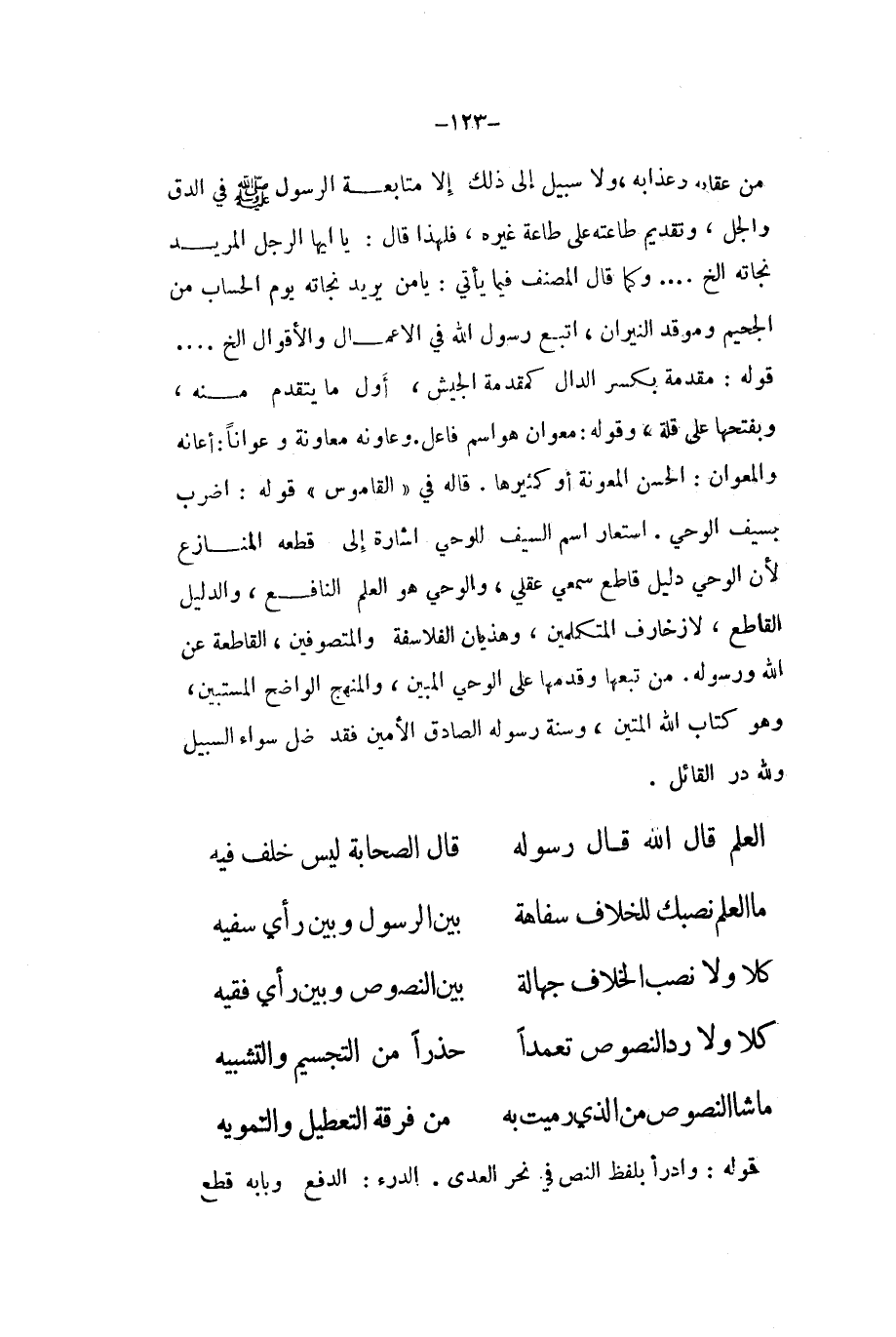 من عِقَابه وعذابه وَلَا سَبِيل إِلَى ذَلِك الا مُتَابعَة الرَّسُول صلى الله عَلَيْهِ وَسلم فِي الدق والجل وَتَقْدِيم طَاعَته على طَاعَة غَيره فَلهَذَا قَالَ يَا ايها الرجل المريد نجاته الخ وكما قَالَ المُصَنّف فِيمَا يَأْتِي يَا من يُرِيد نجاته يَوْم الْحساب من الْجَحِيم وموقد النيرَان اتبع رَسُول الله فِي الاعمال والاقوال الخ قَوْله مُقَدّمَة بِكَسْر الدَّال كمقدمة الْجَيْش أول مَا يتَقَدَّم مِنْهُ وَبِفَتْحِهَا على قلَّة وَقَوله معوان هُوَ اسْم فَاعل وعاونه معاونة وعوانا أَعَانَهُ والمعوان الْحسن المعونة اَوْ كثيرها قَالَه فِي (الْقَامُوس (قَوْله اضْرِب بِسيف الْوَحْي اسْتعَار اسْم السَّيْف للوحي اشارة الى قطعه المنازع لِأَن الْوَحْي دَلِيل قَاطع سَمْعِي عَقْلِي وَالْوَحي هُوَ الْعلم النافع وَالدَّلِيل الْقَاطِع لازخارف الْمُتَكَلِّمين وهذيان الفلاسفة والمتصوفين القاطعة عَن الله وَرَسُوله من تبعها وقدمها على الْوَحْي الْمُبين والمنهج الْوَاضِح المستبين وَهُوَ كتاب الله المتين وَسنة رَسُوله الصَّادِق الامين فقد ضل سَوَاء السَّبِيل وَللَّه در الْقَائِل