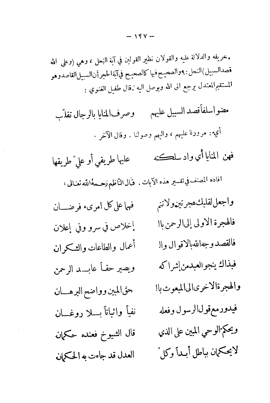 وتعريفه وَالدّلَالَة عَلَيْهِ وَالْقَوْلَان نَظِير الْقَوْلَيْنِ فِي آيَة النَّحْل وَهِي {وعَلى الله قصد السَّبِيل} النَّحْل 9 وَالصَّحِيح فِيهَا كَالصَّحِيحِ فِي آيَة الْحجر أَن السَّبِيل القاصد وَهُوَ الْمُسْتَقيم المعتدل يرجع الى الله ويوصل اليه قَالَ طفيل الغنوي