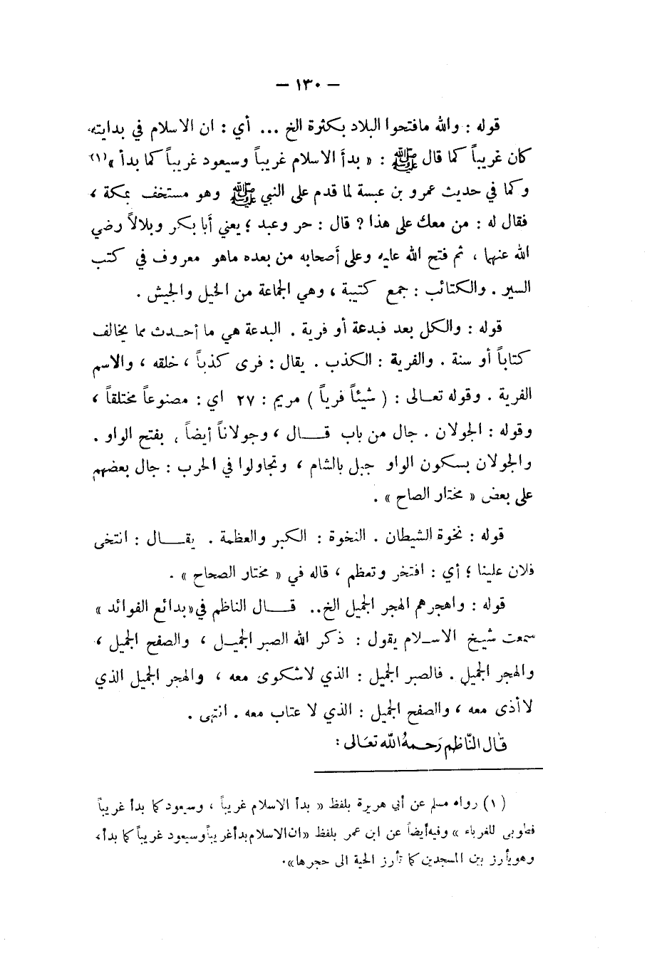 قَوْله واهجرهم الهجر الْجَمِيل الخ قَالَ النَّاظِم فِي (بَدَائِع الْفَوَائِد (سَمِعت شيخ الاسلام يَقُول ذكر الله الصَّبْر الْجَمِيل والصفح الْجَمِيل والهجر الْجَمِيل فالصبر الْجَمِيل الَّذِي لَا شكوى مَعَه والهجر الْجَمِيل الَّذِي لَا أَذَى مَعَه والصفح الْجَمِيل الَّذِي لَا عتاب مَعَه انْتهى