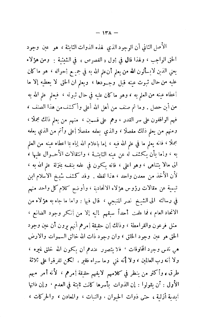 الأَصْل الثَّانِي أَن الْوُجُود الَّذِي لهَذِهِ الذوات الثَّابِتَة هُوَ عين وجود الْحق الْوَاجِب وَلِهَذَا قَالَ فِي أول (الفصوص (فِي الشيشية وَمن هَؤُلَاءِ يعْنى الَّذين لَا يسْأَلُون الله من يعلم أَن علم الله بِهِ فِي جَمِيع أَحْوَاله هُوَ مَا كَانَ عَلَيْهِ من حَال ثُبُوت عينه قبل وجودهَا وَيعلم أَن الْحق لَا يُعْطِيهِ إِلَّا مَا أعطَاهُ عينه من الْعلم بِهِ وَهُوَ مَا كَانَ عَلَيْهِ فِي حَال ثُبُوته فَيعلم علم الله بِهِ من أَيْن حصل وَمَا ثمَّ صنف من أهل الله أَعلَى وأكشف من هَذَا الصِّنْف فهم الواقفون على سر الْقدر وهم على قسمَيْنِ مِنْهُم من يعلم ذَلِك مُجملا وَمِنْهُم من يعلم ذَلِك مفصلا وَالَّذِي يُعلمهُ مفصلا أَعلَى وَأتم من الَّذِي يُعلمهُ مُجملا فَإِنَّهُ يعلم مَا فِي علم الله فِيهِ وَإِمَّا بإعلام الله إِيَّاه بِمَا أعطَاهُ عينه من الْعلم بِهِ وَإِمَّا بِأَن يكْشف لَهُ عَن عينه الثَّابِتَة وانتقالات الْأَحْوَال عَلَيْهَا إِلَى مَالا يتناهى وَهُوَ أَعلَى فَإِنَّهُ يكون فِي علمه بِنَفسِهِ بِمَنْزِلَة علم الله بِهِ لِأَن الْأَخْذ من مَعْدن وَاحِد هَذَا لَفظه وَقد كشف شيخ الْإِسْلَام ابْن تَيْمِية عَن مقالات رُؤُوس هَؤُلَاءِ الإتحادية وأوضح كَلَام كل وَاحِد مِنْهُم فِي رسَالَته إِلَى الشَّيْخ نصر المنبجي قَالَ فِيهَا وَأما مَا جَاءَ بِهِ هَؤُلَاءِ من الإتحاد الْعَام فَمَا علمت أحدا سبقهمْ إِلَيْهِ إِلَّا من أنكر وجود الصَّانِع مثل فِرْعَوْن والقرامطة وَذَلِكَ أَن حَقِيقَة أَمرهم أَنهم يرَوْنَ أَن عين وجود الْحق هُوَ عين وجود الْخلق وان وجود ذَات الله خَالق السَّمَوَات وَالْأَرْض هِيَ نفس وجود الْمَخْلُوقَات وَلَا أَنه غَنِي وَمَا سواهُ فَقير لَكِن تفَرقُوا على ثَلَاثَة طرق وَأكْثر من ينظر فِي كَلَامهم لَا يفهم حَقِيقَة أَمرهم لِأَنَّهُ أَمر مُبْهَم الأول أَن يَقُولُوا إِن الذوات بأسرها كَانَت ثَابِتَة فِي الْعَدَم وَإِن ذَاتهَا أبدية أزلية حَتَّى ذَوَات الْحَيَوَان والنبات والمعادن والحركات
