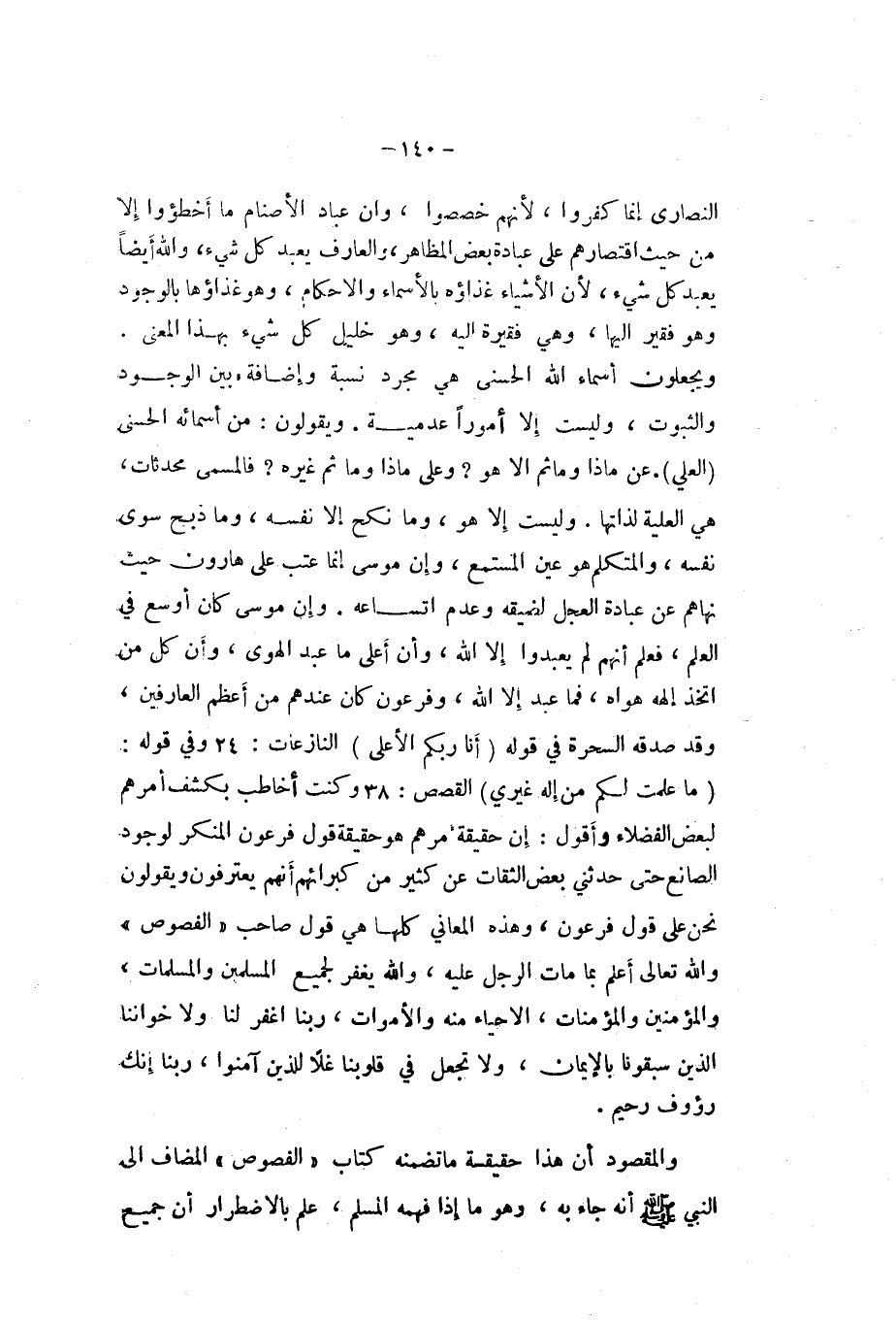 النَّصَارَى إِنَّمَا كفرُوا لأَنهم خصصوا وَأَن عباد الْأَصْنَام مَا أخطؤوا إِلَّا من حَيْثُ اقتصارهم على عبَادَة بعض الْمظَاهر والعارف يعبد كل شيئ وَالله أَيْضا يعبد كل شيئ لِأَن الْأَشْيَاء غذاؤه بالأسماء والاحكام وَهُوَ غذاؤها بالوجود وَهُوَ فَقير إِلَيْهَا وَهِي فقيرة إِلَيْهِ وَهُوَ خَلِيل كل شيئ بهذاالمعنى ويجعلون أسم الله الْحسنى هِيَ مُجَرّد نِسْبَة وَإِضَافَة بَين الْوُجُود والثبوت وَلَيْسَت إِلَّا أُمُور عدمية وَيَقُولُونَ من أَسْمَائِهِ الْحسنى (الْعلي) عَن مَاذَا وَمَا ثمَّ إِلَّا هُوَ وعَلى مَاذَا وَمَا ثمَّ غَيره فالمسمى محدثات هِيَ الْعلية لذاتها وَلَيْسَت إِلَّا هُوَ وَمَا نكح إِلَّا نَفسه وَمَا ذبح سوى نَفسه والمتكلم هُوَ عين المستمع وَأَن مُوسَى إِنَّمَا عتب على هَارُون حَيْثُ نَهَاهُم عَن عبَادَة الْعجل لضيقة وَعدم اتساعه وَإِن مُوسَى كَانَ أوسع فِي الْعلم فَعلم أَنهم لم يعبدوا إِلَّا الله وَأَن أَعلَى مَا عبد الْهوى وَأَن كل من اتخذ إلهه هَوَاهُ فَمَا عبد إِلَّا الله وَفرْعَوْن كَانَ عِنْدهم من أعظم العارفين وَقد صدقه السَّحَرَة فِي قَوْله {أَنا ربكُم الْأَعْلَى} النازعات 24 وَفِي قَوْله {مَا علمت لكم من إِلَه غَيْرِي} الْقَصَص 38 وَكنت أخاطب بكشف أَمرهم لبَعض الْفُضَلَاء وَأَقُول إِن حَقِيقَة أَمرهم هُوَ حَقِيقَة قَول فِرْعَوْن الْمُنكر لوُجُود الصَّانِع حَتَّى حَدثنِي بعض الثِّقَات عَن كثير من كبرائهم أَنهم يعترفون وَيَقُولُونَ نَحن على قَول فِرْعَوْن وَهَذِه الْمعَانِي كلهَا هِيَ قَول صَاحب (الفصوص (وَالله تَعَالَى أعلم بِمَا مَاتَ الرجل عَلَيْهِ وَالله يغْفر لجَمِيع الْمُسلمين وَالْمُسلمَات وَالْمُؤمنِينَ وَالْمُؤْمِنَات الْأَحْيَاء مِنْهُ والأموات رَبنَا اغْفِر لنا وَلِإِخْوَانِنَا الَّذين سبقُونَا بِالْإِيمَان وَلَا تجْعَل فِي قُلُوبنَا غلا للَّذين آمنُوا رَبنَا إِنَّك رؤوف رَحِيم