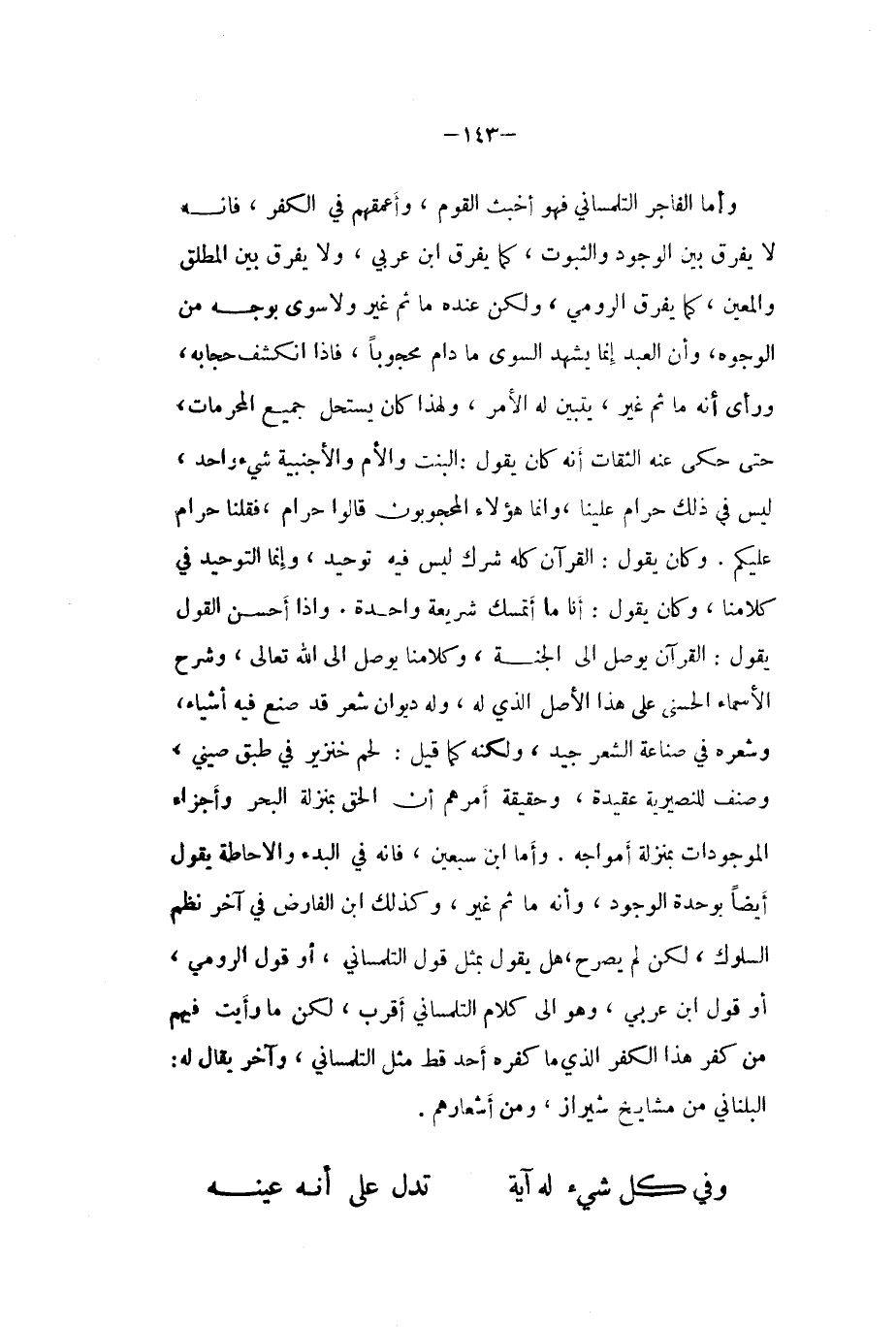 وَأما الْفَاجِر التلمساني فَهُوَ أَخبث الْقَوْم وأعمقهم فِي الْكفْر فَإِنَّهُ لَا يفرق بَين الْوُجُود والثبوت كَمَا يفرق ابْن عَرَبِيّ وَلَا يفرق بَين الْمُطلق والمعين كَمَا يفرق الرُّومِي وَلَكِن عِنْده مَا ثمَّ غير وَلَا سوى بِوَجْه من الْوُجُوه وَأَن العَبْد إِنَّمَا يشْهد السوى مَا دَامَ محجوبا فَإِذا انْكَشَفَ حجابه وَرَأى أَنه مَا ثمَّ غير يتَبَيَّن لَهُ الْأَمر وَلِهَذَا كَانَ يسْتَحل جَمِيع الْمُحرمَات حَتَّى حكى عَنهُ الثِّقَات أَنه كَانَ يَقُول الْبِنْت وَالأُم والأجنبية شيئ وَاحِد لَيْسَ فِي ذَلِك حرَام علينا وَإِنَّمَا هَؤُلَاءِ المحجوبون قَالُوا حرَام فَقُلْنَا حرَام عَلَيْكُم وَكَانَ يَقُول الْقُرْآن كُله شرك لَيْسَ فِيهِ تَوْحِيد وَإِنَّمَا التَّوْحِيد فِي كلامنا وَكَانَ يَقُول أَنا مَا أتمسك شَرِيعَة وَاحِدَة وَإِذا أحسن القَوْل يَقُول الْقُرْآن يُوصل إِلَى الْجنَّة وكلامنا يُوصل إِلَى الله تَعَالَى وَشرح الْأَسْمَاء الْحسنى على هَذَا الأَصْل الَّذِي لَهُ ولد ديوَان شعر قد صنع فِيهِ أَشْيَاء وشعره فِي صناعَة الشّعْر جيد وَلكنه كَمَا قيل لحم خِنْزِير فِي طبق صيني وصنف للنصيرية عقيدة وَحَقِيقَة أَمرهم أَن الْحق بِمَنْزِلَة الْبَحْر وأجزاء الموجودات بِمَنْزِلَة أمواجه وَأما ابْن سبعين فَإِنَّهُ فِي البدء والاحاطة يَقُول أَيْضا بوحدة الْوُجُود وَأَنه مَا ثمَّ غير وَكَذَلِكَ ابْن الفارض فِي آخر نظم السلوك لَكِن لم يُصَرح هَل يَقُول بِمثل قَول التلمساني أَو قَول الرُّومِي أَو قَول ابْن عَرَبِيّ وَهُوَ إِلَى كَلَام التلمساني أقرب لَكِن مَا رَأَيْت فيهم من كفر هَذَا الْكفْر الَّذِي مَا كفره اُحْدُ قطّ مثل التلمساني وَآخر يُقَال لَهُ البلناني من مَشَايِخ شيراز وَمن أشعارهم