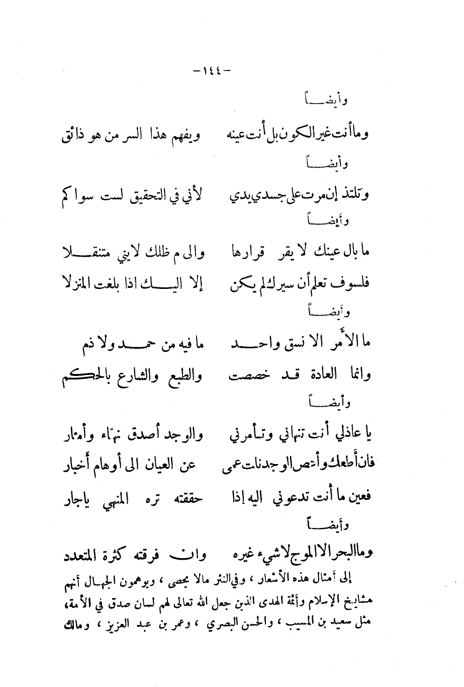 ألى أَمْثَال هَذِه الاشعار وَفِي النثر مَالا يُحْصى ويوهمون الْجُهَّال أَنهم مَشَايِخ الاسلام وأئمة الْهدى الَّذين جعل الله تَعَالَى لَهُم لِسَان صدق فِي الامة مثل سعيد بن الْمسيب وَالْحسن الْبَصْرِيّ وَعمر بن عبد الْعَزِيز وَمَالك