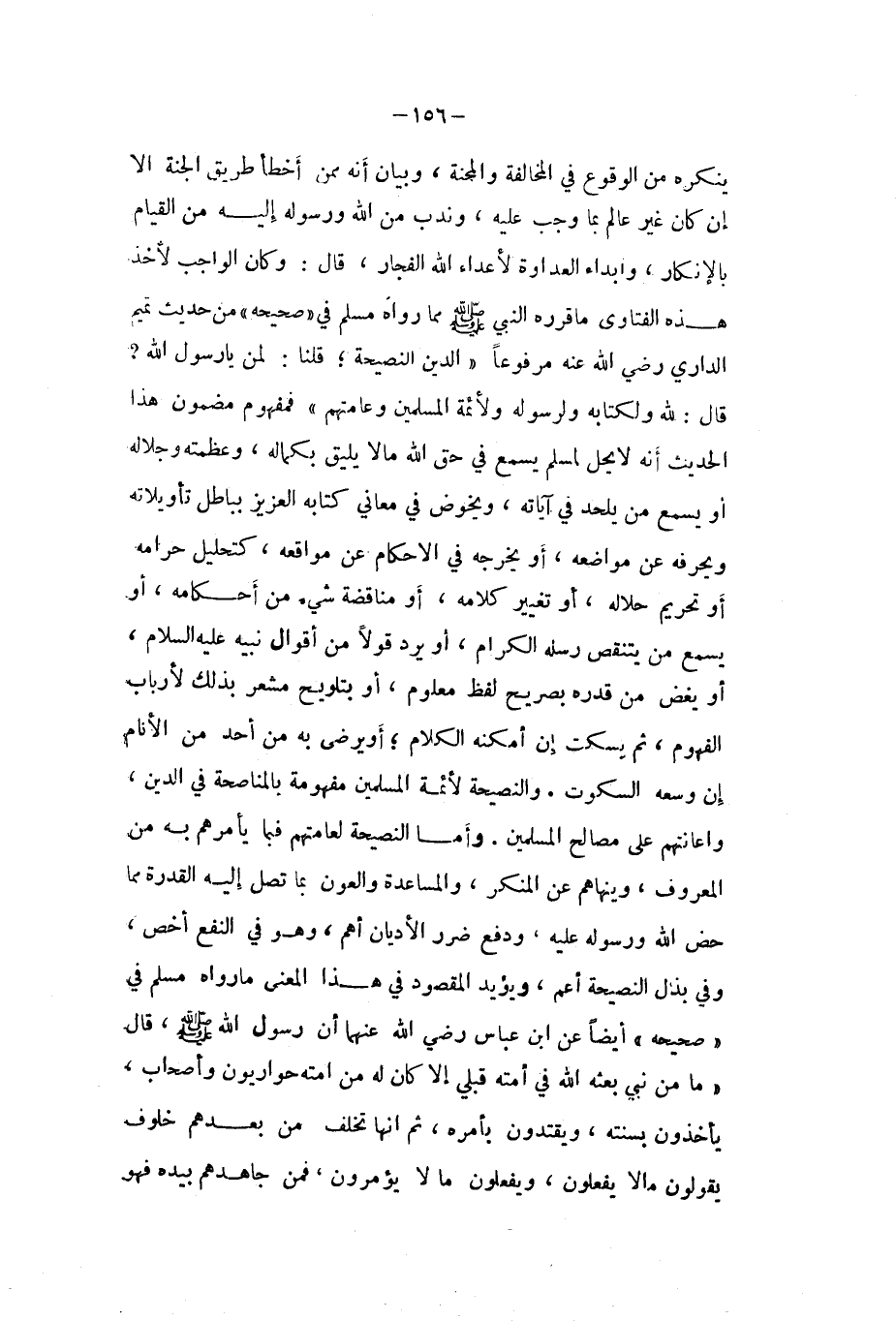 يُنكره من الْوُقُوع فِي الْمُخَالفَة والمحنة وَبَيَان أَنه مِمَّن أَخطَأ طَرِيق الْجنَّة الا أَن كَانَ غير عَالم بِمَا وَجب عَلَيْهِ وَندب من الله وَرَسُوله إِلَيْهِ من الْقيام بالانكار وابداء الْعَدَاوَة لأعداء الله الْفجار قَالَ وَكَانَ الْوَاجِب لاخذ هَذِه الْفَتَاوَى مَا قَرَّرَهُ النَّبِي صلى الله عَلَيْهِ وَسلم مِمَّا رَوَاهُ مُسلم فِي (صَحِيحه (من حَدِيث تَمِيم الدَّارِيّ رَضِي الله عَنهُ مَرْفُوعا (الدّين النَّصِيحَة (قُلْنَا لمن يَا رَسُول الله قَالَ لله ولكتابه وَلِرَسُولِهِ ولائمة الْمُسلمين وعامتهم (فمفهوم مَضْمُون هَذَا الحَدِيث أَنه لَا يحل لمُسلم يسمع فِي حق الله مَا لَا يَلِيق بِكَمَالِهِ وعظمته وجلاله اَوْ يسمع من يلْحد فِي آيَاته ويخوض فِي مَعَاني كِتَابه الْعَزِيز بباطل تأويلاته ويحرفه عَن موَاضعه أَو يُخرجهُ فِي الاحكام عَن مواقعه كتحليل حرَامه أَو تَحْرِيم حَلَاله أَو تَغْيِير كَلَامه أَو مناقضة شَيْء من أَحْكَامه اَوْ يسمع من يتنقص رسله الْكِرَام اَوْ يرد قولا من أَقْوَال نبيه عَلَيْهِ السَّلَام اَوْ يغض من قدره بِصَرِيح لفظ مَعْلُوم اَوْ بتلويح مشْعر بذلك لارباب الفهوم ثمَّ يسكت إِن امكنه الْكَلَام اَوْ يرضى بِهِ من أحد من الانام أَن وَسعه السُّكُوت والنصيحة لائمة الْمُسلمين مَفْهُومه بالمناصحة فِي الدّين واعانتهم على مصَالح الْمُسلمين وَأما النَّصِيحَة لعامتهم فبمَا يَأْمُرهُم بِهِ من الْمَعْرُوف وينهاهم عَن الْمُنكر والمساعدة والعون بِمَا تصل أليه الْقُدْرَة مِمَّا حض الله وَرَسُوله عَلَيْهِ وَدفع ضَرَر الاديان أهم وَهُوَ فِي النَّفْع أخص وَفِي بذل النَّصِيحَة أَعم وَيُؤَيّد الْمَقْصُود فِي هَذَا الْمَعْنى مَا رَوَاهُ مُسلم فِي (صَحِيحه (أَيْضا عَن ابْن عَبَّاس رَضِي الله عَنْهُمَا ان رَسُول الله صلى الله عَلَيْهِ وَسلم قَالَ (مَا من نَبِي بَعثه الله فِي أمته قبلي الا كَانَ لَهُ من امته حواريون وَأَصْحَاب يَأْخُذُونَ بسنته ويقتدون بأَمْره ثمَّ انها تخلف من بعدهمْ خلوف يَقُولُونَ مَا لَا يَفْعَلُونَ ويفعلون مَا لَا يؤمرون فَمن جاهدهم بِيَدِهِ فَهُوَ